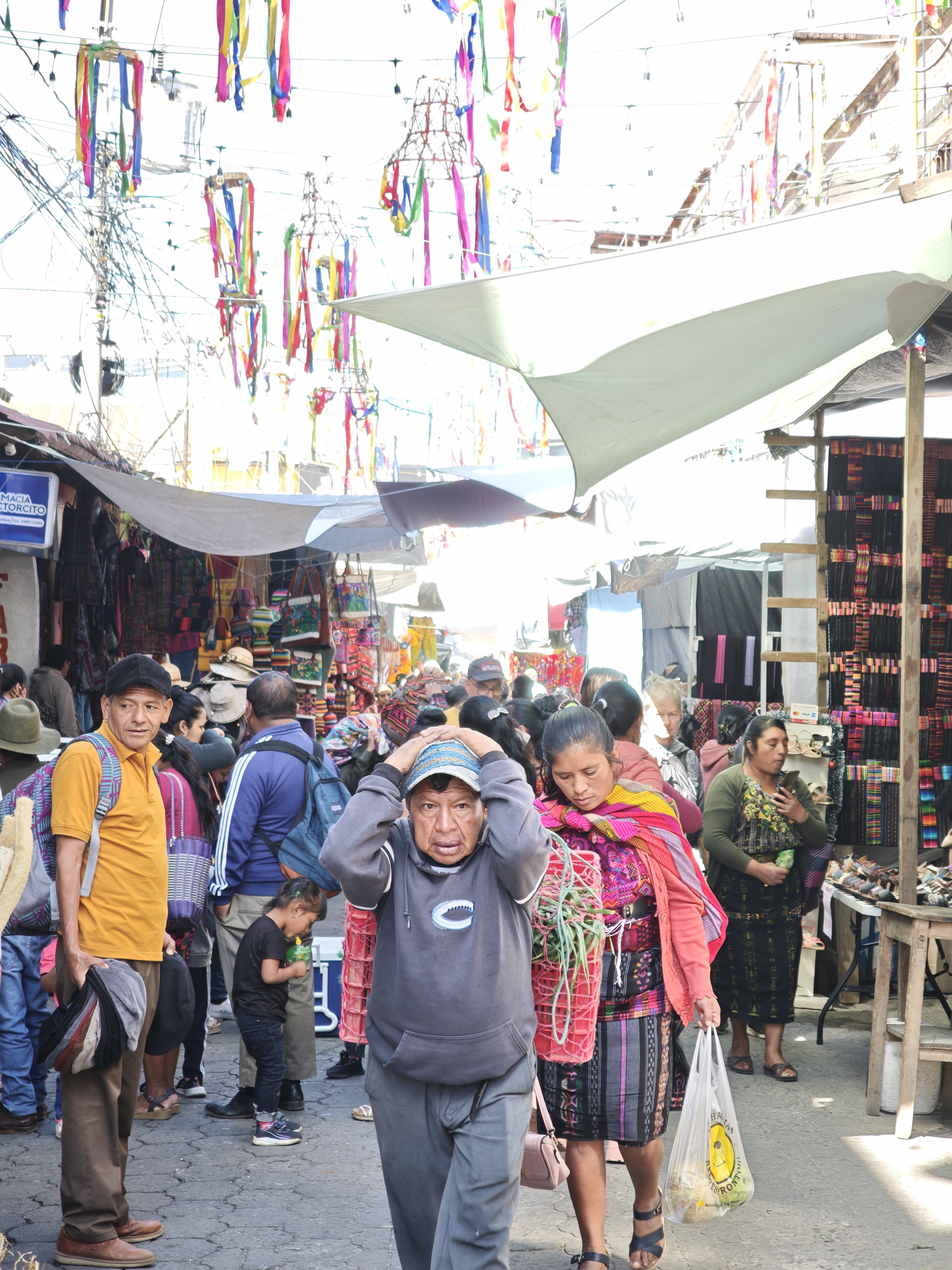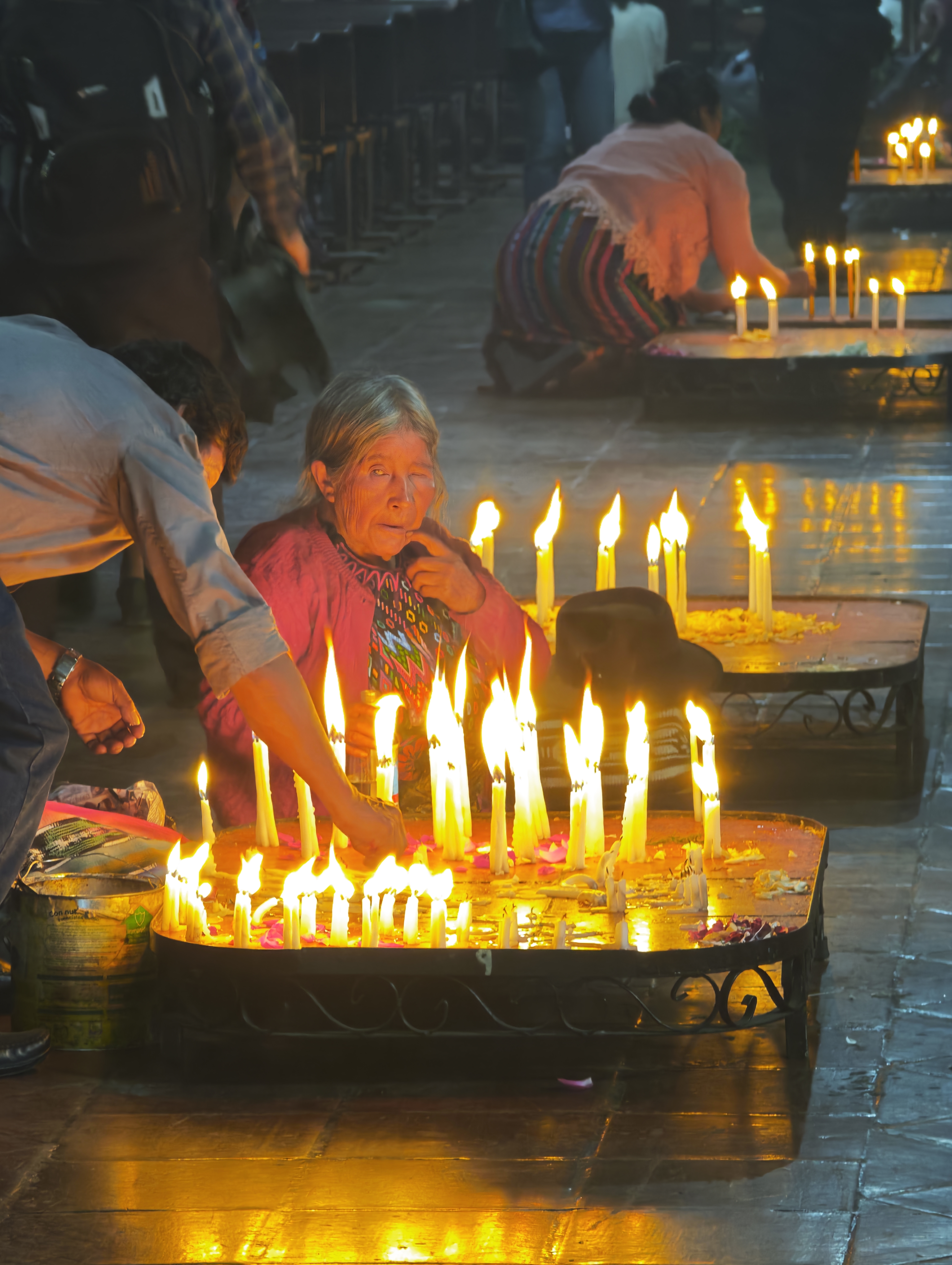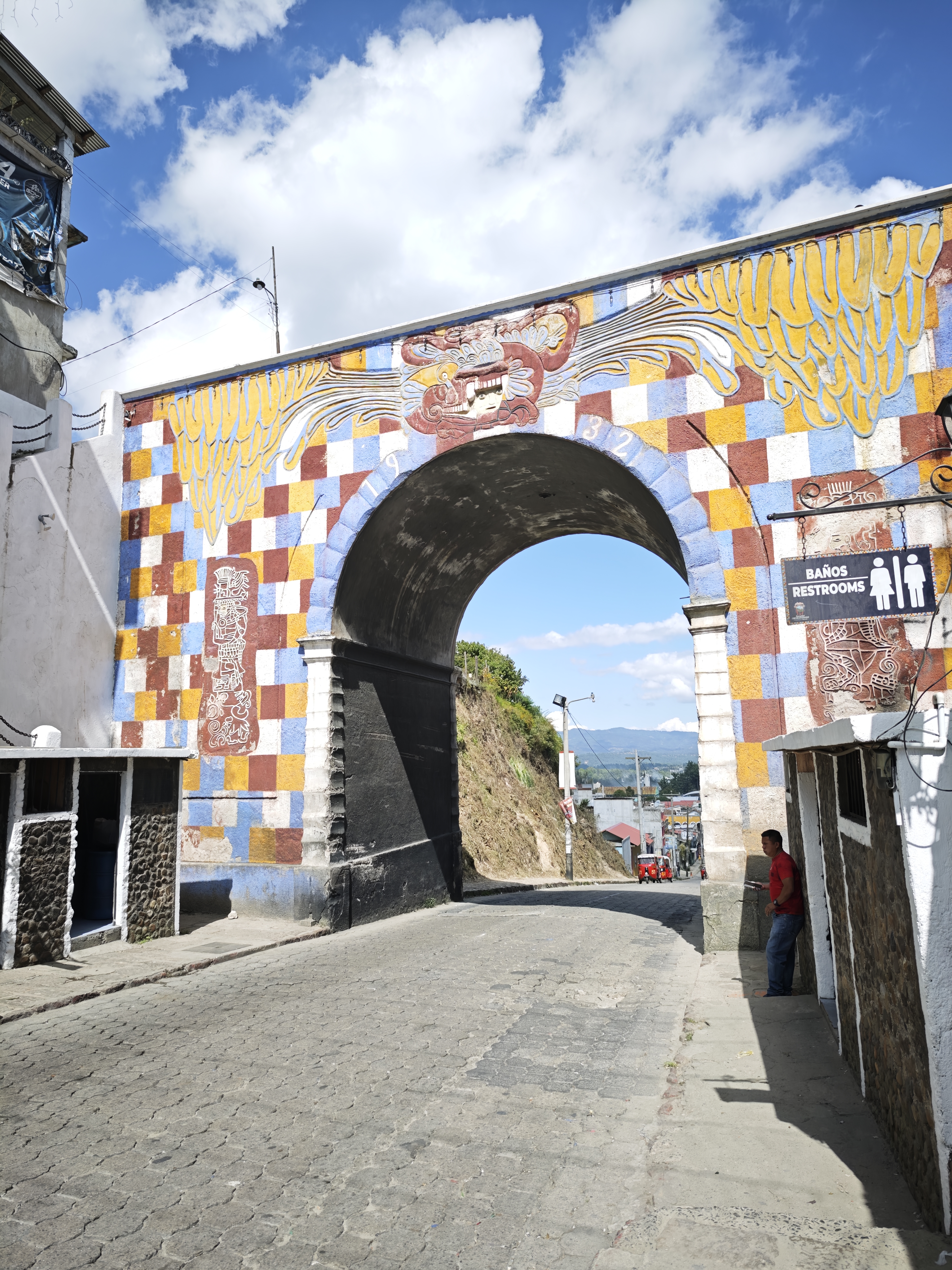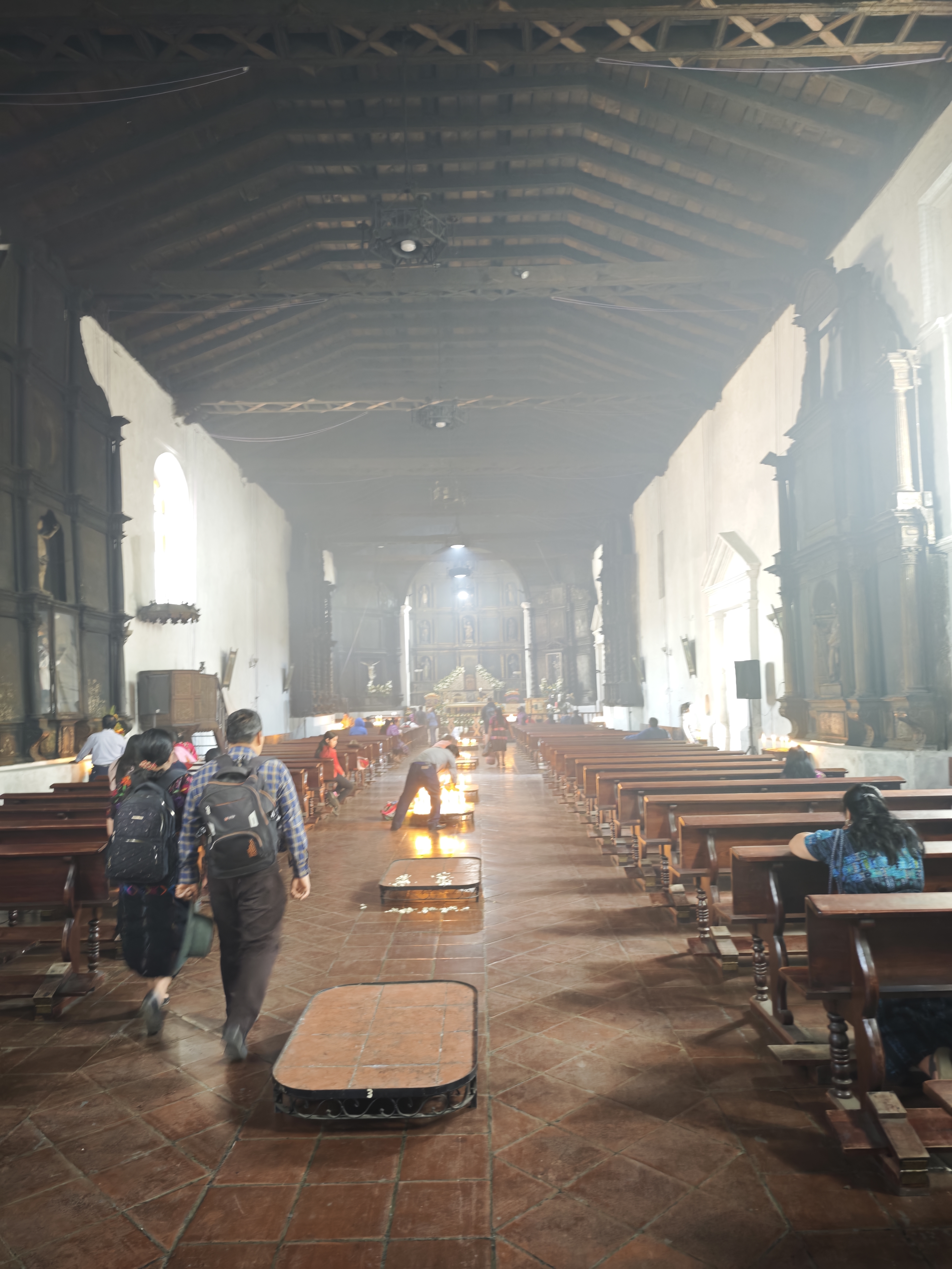 Al sur de la quinta avenida, donde se situaban la mayor parte de puestos del mercado, estaba la iglesia de Santo Tomás coronándolo todo con unas escalinatas de separación con el gentío del mercado, donde se sentaban guatemaltecas vendiendo artesanía. Al subir los largos escalones me encontré con un ritual de humo sagrado en la misma puerta de la iglesia, que si o si debía atravesar si quería ver el interior, tosiendo entré a la iglesia y me asombró los altares de velas en el suelo y la gente rezando, un ambiente ahumado lo envolvía todo e iba subiendo hasta las cuadernas de oscura madera del techo del recinto. Murmullos de rezos y humo daban al lugar un aire místico, casi de ensueño que me tuvo perplejo un rato, charlé un rato con Dios y lleno de paz me dispuse a salir por la puerta lateral para evitar el humo sagrado de la entrada pero me encontré con otro humo aun más denso. Al final salí corriendo de la iglesia como un hereje oliendo a humo y boqueando como pez fuera del agua. Me sumergí en el mercado de nuevo y me dejé llevar sin prisas hasta alcanzar el Arco Gucumatz y anduve hasta encontrarme solo en la carretera con pereza de volver a subir la cuesta.