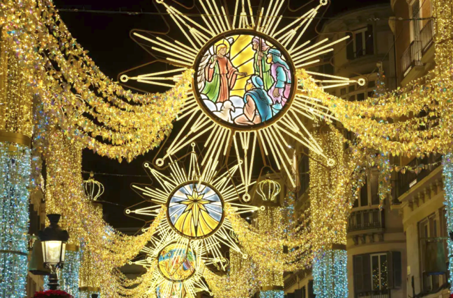 Tres años después, los ‘ángeles celestiales’ que coronaban los arcos luminosos de la Calle Larios han sido sustituidos por escenas de la Natividad.