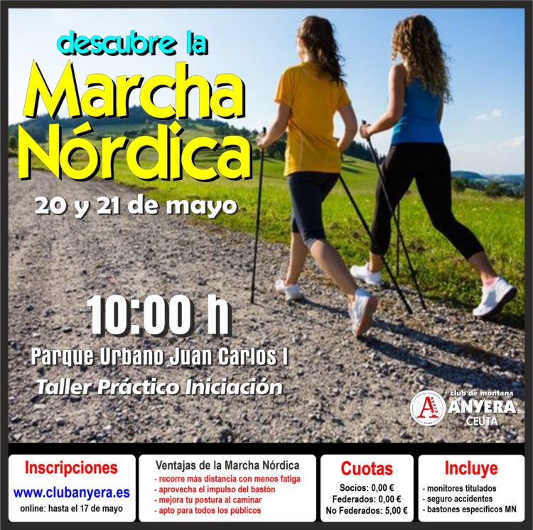 El Club de Montaña Anyera organiza los próximos días 20 y 21 de mayo un nuevo taller de Iniciación a la Marcha Nórdica que se desarrollará en las inmediaciones de las instalaciones del Club, en el Parque Urbano Juan Carlos I (Bajos de La Marina).
