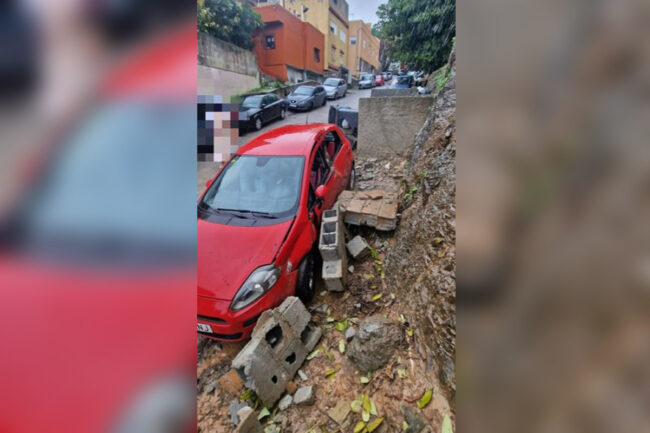 Bomberos y Policía Local de Ceuta tuvieron que acudir este domingo a la barriada del Príncipe, en concreto a la calle Este, ante un desprendimiento de tierra que causó daños graves tanto en un coche como en un contenedor.