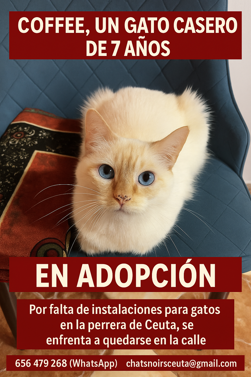 Coffee tiene 7 años y toda su vida ha transcurrido en un hogar. Su carácter tranquilo y su condición de gato casero hacen que dependa del entorno seguro que siempre ha conocido. Sin embargo, tras la imposibilidad de su familia de seguir cuidándolo, su destino debería haber sido el zoosanitario municipal de Ceuta, tal y como marca la normativa. Según denuncia la asociación Chats Noirs, el centro se negó a admitirlo alegando falta de espacio, lo que deja a este felino desprotegido y expuesto al abandono en la vía pública.