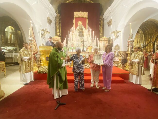 Durante la intervención posterior, se subrayó el profundo simbolismo de esta distinción, que se reserva a quienes han dejado una huella espiritual imborrable en la Hermandad. “Así como dos son los angelitos que sostienen el escudo de nuestra Virgen, o dos las columnas de Hércules que enmarcan nuestro Estrecho, dos son también los pilares que hoy reconocemos: Inés y Encarna”, se proclamó ante un Santuario emocionado. “Por su devoción, su testimonio, su edad y, sobre todo, por su cariño, hoy se dejan bañar del oro de la historia de nuestra hermandad”.