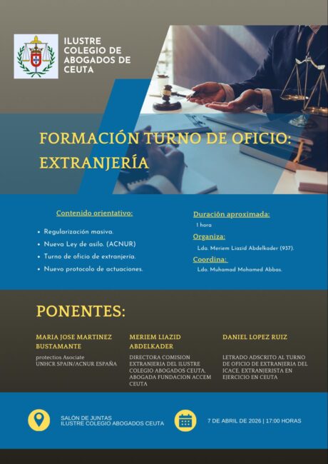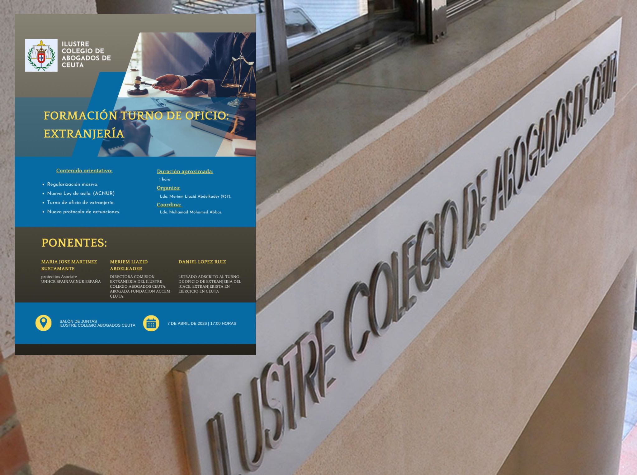 El Colegio de Abogados de Ceuta, a través de su Comisión de Formación, ha organizado una jornada formativa centrada en el turno de oficio en materia de extranjería, que tendrá lugar el próximo 7 de abril a las 17:00 horas en el Salón de Juntas de la sede colegial.