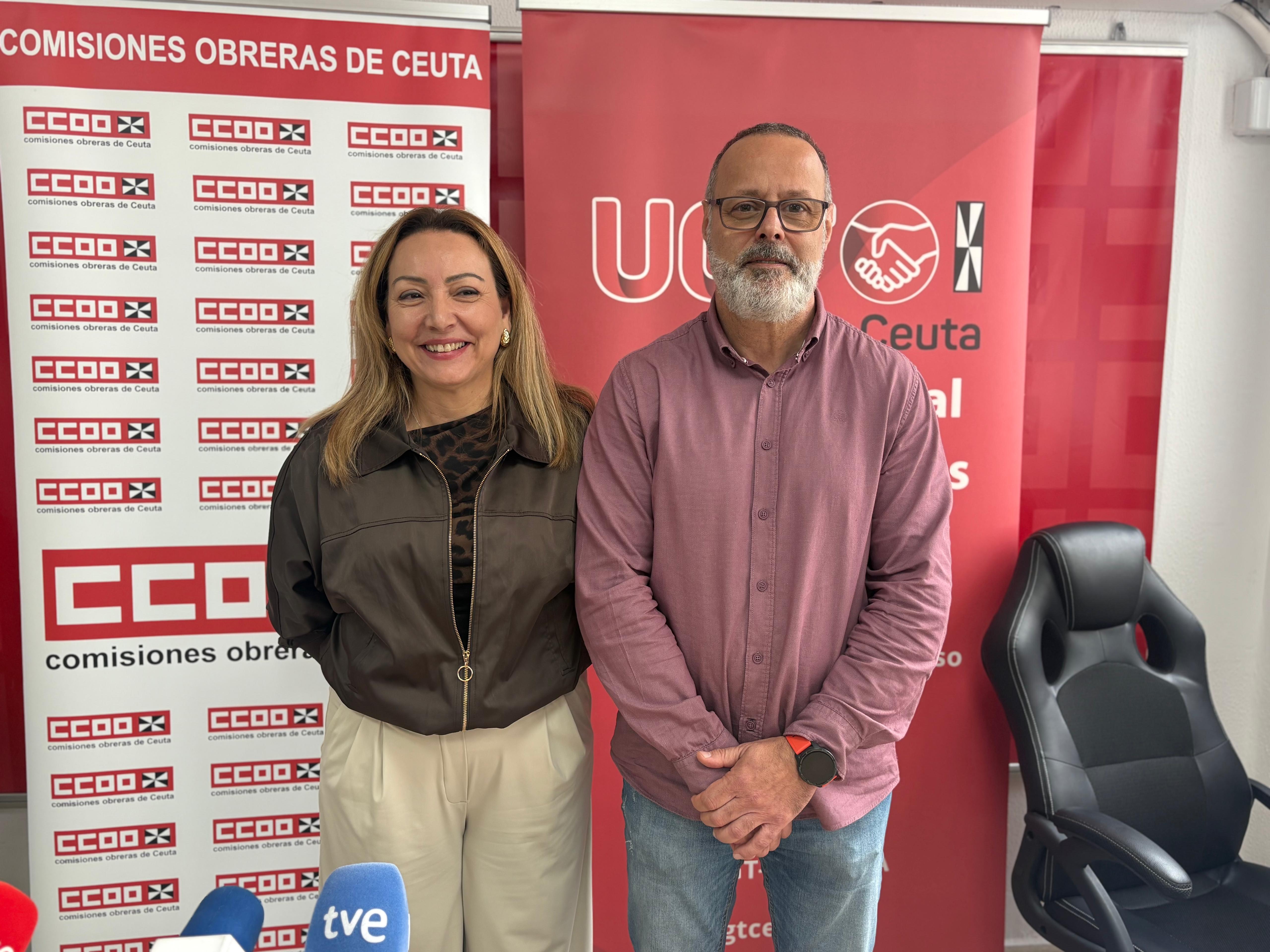En la rueda de prensa han comparecido la secretaria general de UGT Ceuta, Yolanda Aparicio, y el secretario general de CCOO Ceuta, Ángel Lara, acompañados en la mesa por Tomás Ascaso, secretario de Organización de UGT, y Pablo Caballero, secretario de Organización de CCOO.