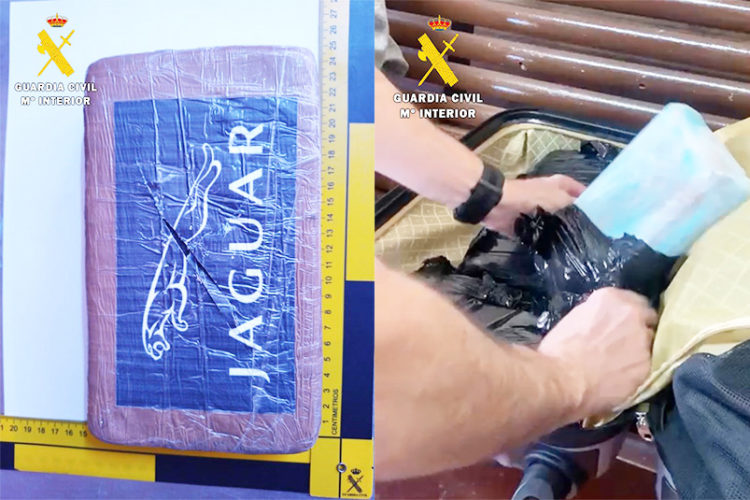 La droga, repartida en bloques con la marca Jaguar y oculta en una maleta de viaje, fue intervenida por los agentes de la Benemérita y analizada por el área de Sanidad de la Delegación del Gobierno.