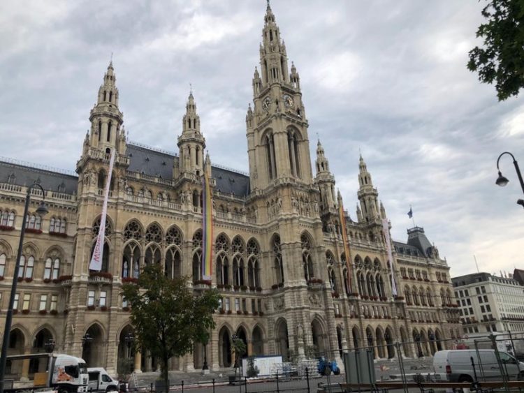 Refiriéndonos al Ayuntamiento, pudimos comprobar que se trata de un impresionante edificio neogótico, construido de 1872 a 1883, siendo Francisco José I quien puso la primera piedra. Sede oficial del Alcalde y centro de reuniones del Concejo Municipal y del Senado, acoge también la Biblioteca Nacional y Regional Perimetralmente, en unas alquerías se ubican imágenes de ilustres personajes históricos. Su espectacular interior, cuenta con 1.500 habitaciones, 2.000 ventanas, Salón de Ceremonias, enorme guardarropa, un inmenso jardín, Patio de las Arcadas, seis de menor tamaño y un sótano con restaurante. Su magnífica fachada incluye cinco torres, una central de aguja de 97,9 metros de altura y dos más pequeñas a cada lado. Parece ser que la torre central, según instrucciones de Francisco José, no podía elevarse más de los 99 metros de las torres de la Iglesia Votiva. Sin embargo, los superan porque sobre ella culmina la imagen del rathausmann, una figura con portaestandarte de unos 5,4 metros, que es un símbolo de la ciudad.