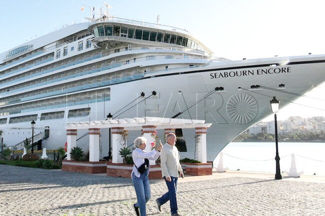 Esta es la imagen que se ha observado en las inmediaciones de la avenida Cañonero Dato que, por momentos, se ha llenado de turistas. Han desembarcado a bordo del Seabourn Encore, un navío que forma parte de una experiencia de lujo.