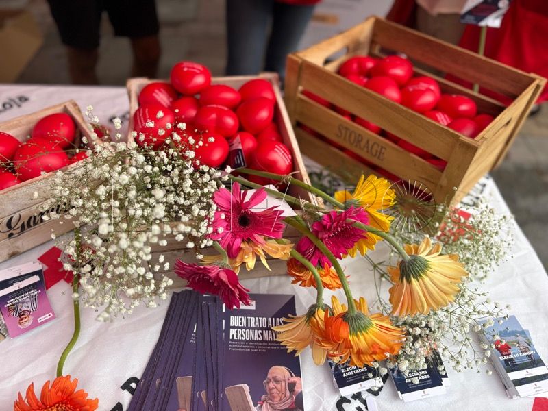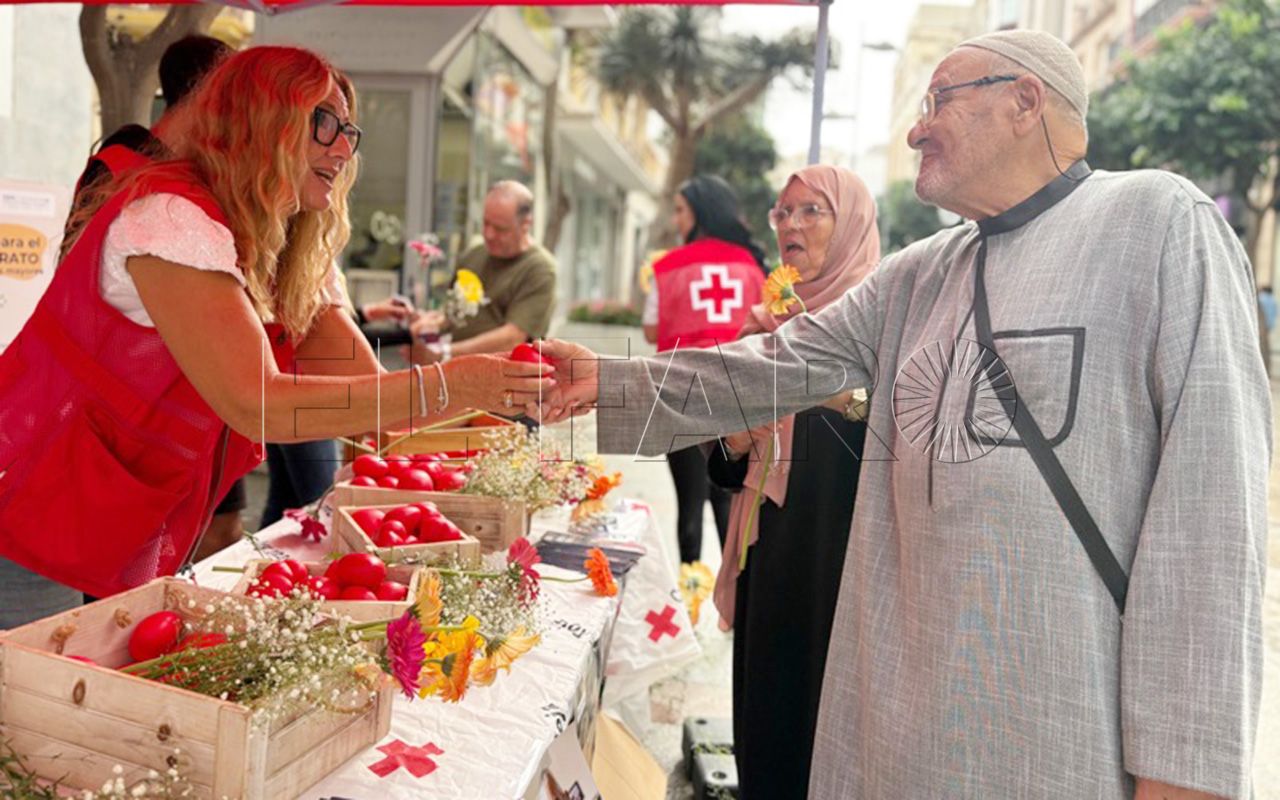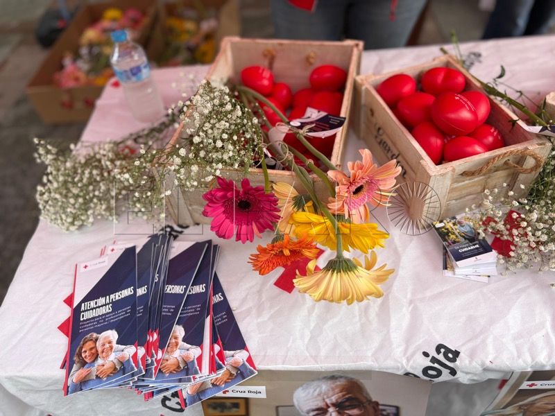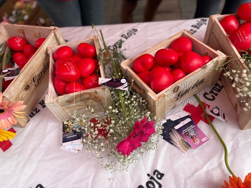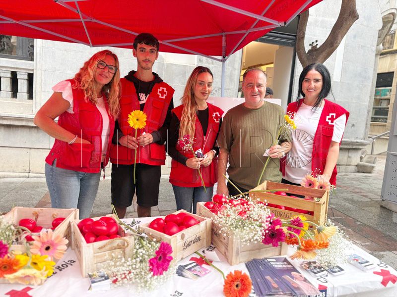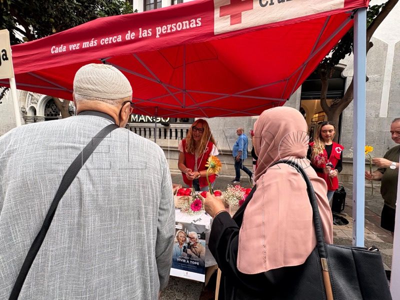 Tras el desayuno, la actividad ha continuado en el Paseo del Revellín, donde Cruz Roja ha instalado un stand informativo y de sensibilización. Allí, voluntarios, jóvenes y mayores comparten espacio con los viandantes, repartiendo flores y pequeños obsequios elaborados en talleres de alfabetización.