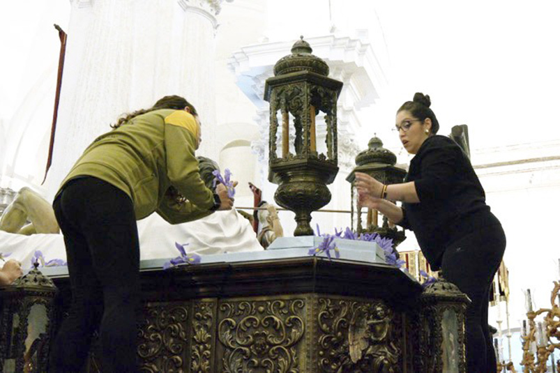 Casado indica que ya está todo organizado antes de la llegada de la procesión. “Solo quedan unos retoques. Ya se hizo el traslado. Las imágenes ya están montadas. Solo quedan colocar flores y montar los varales del palio”, señala. A diferencia del caso de las costaleras, tienen un buen número de penitentes. Este año incluso hay más mantillas.