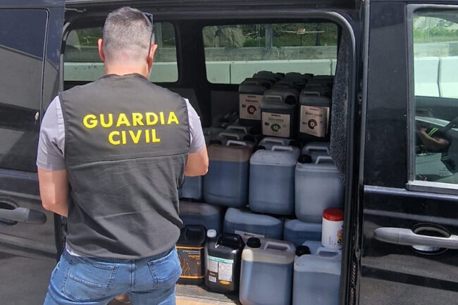 El autor de los hechos transportaba las sustancias en numerosas garrafas de plástico. Una vez extraídas se contabilizaron un total de 618 litros, con un valor de mercado superior a 16.000 euros.