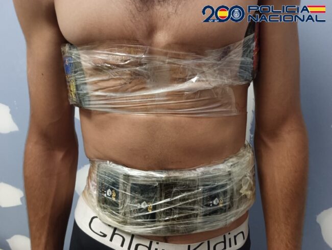 La Jefatura Superior de la Policía Nacional de Ceuta ha comunicado la detención de un varón por portar dos kilos de hachís enfajados a su cuerpo, tanto en el abdomen, una zona conocida popularmente como 'tableta de chocolate', como en los pectorales y las piernas.