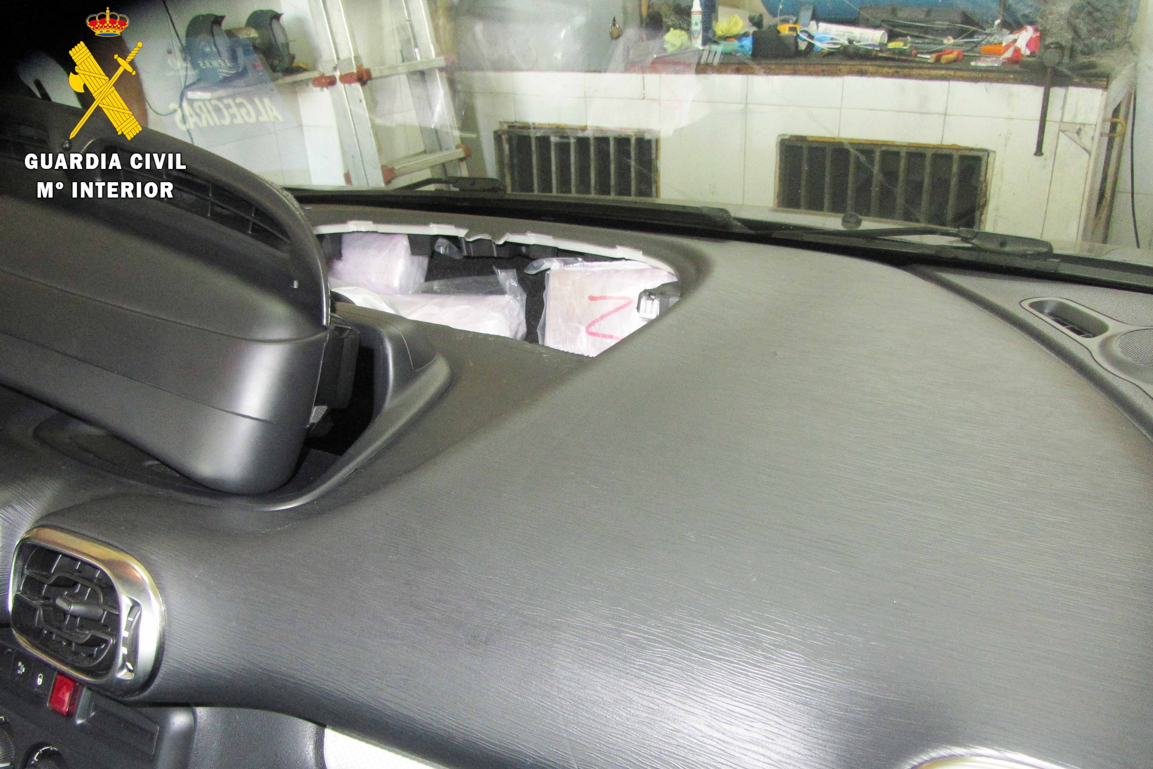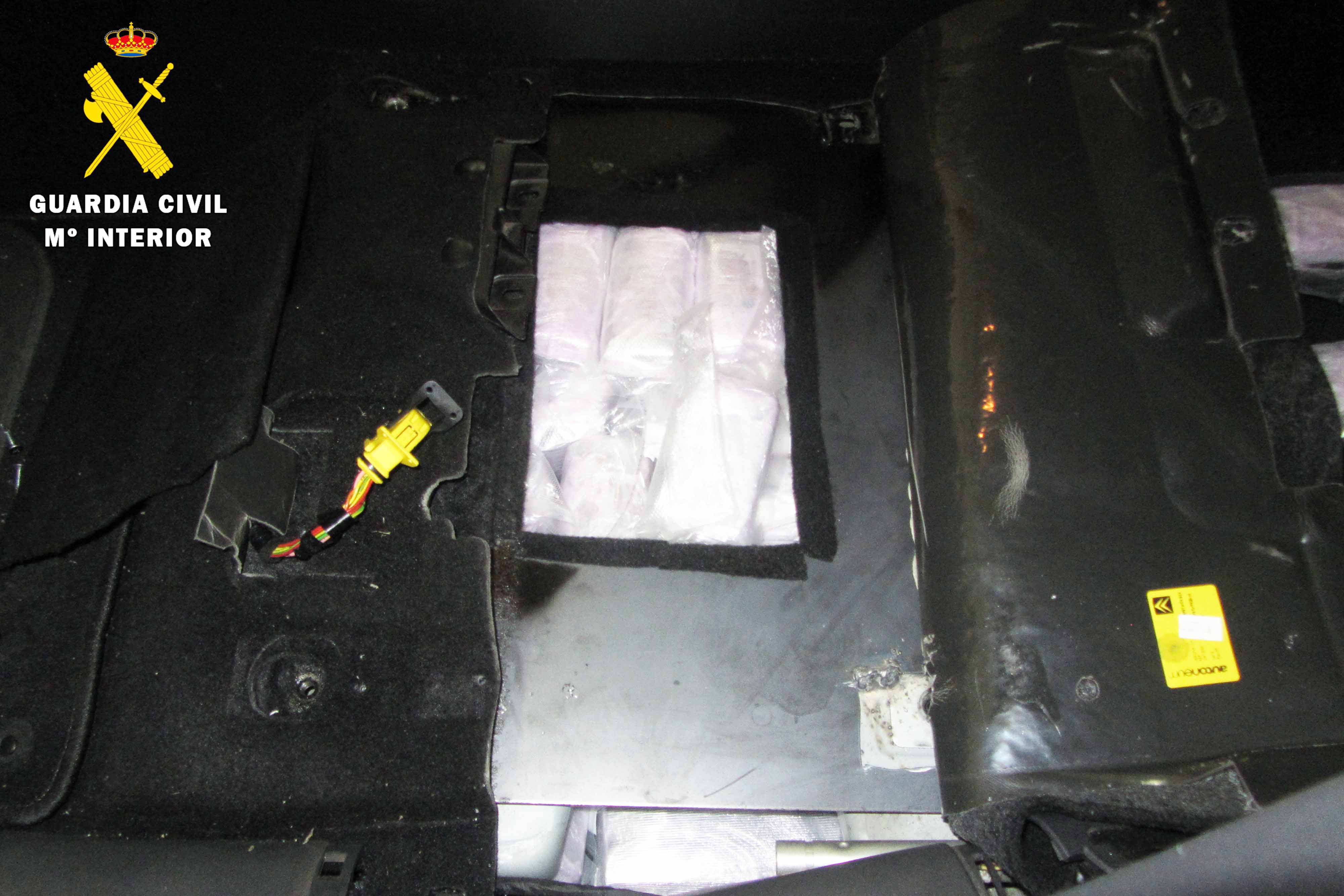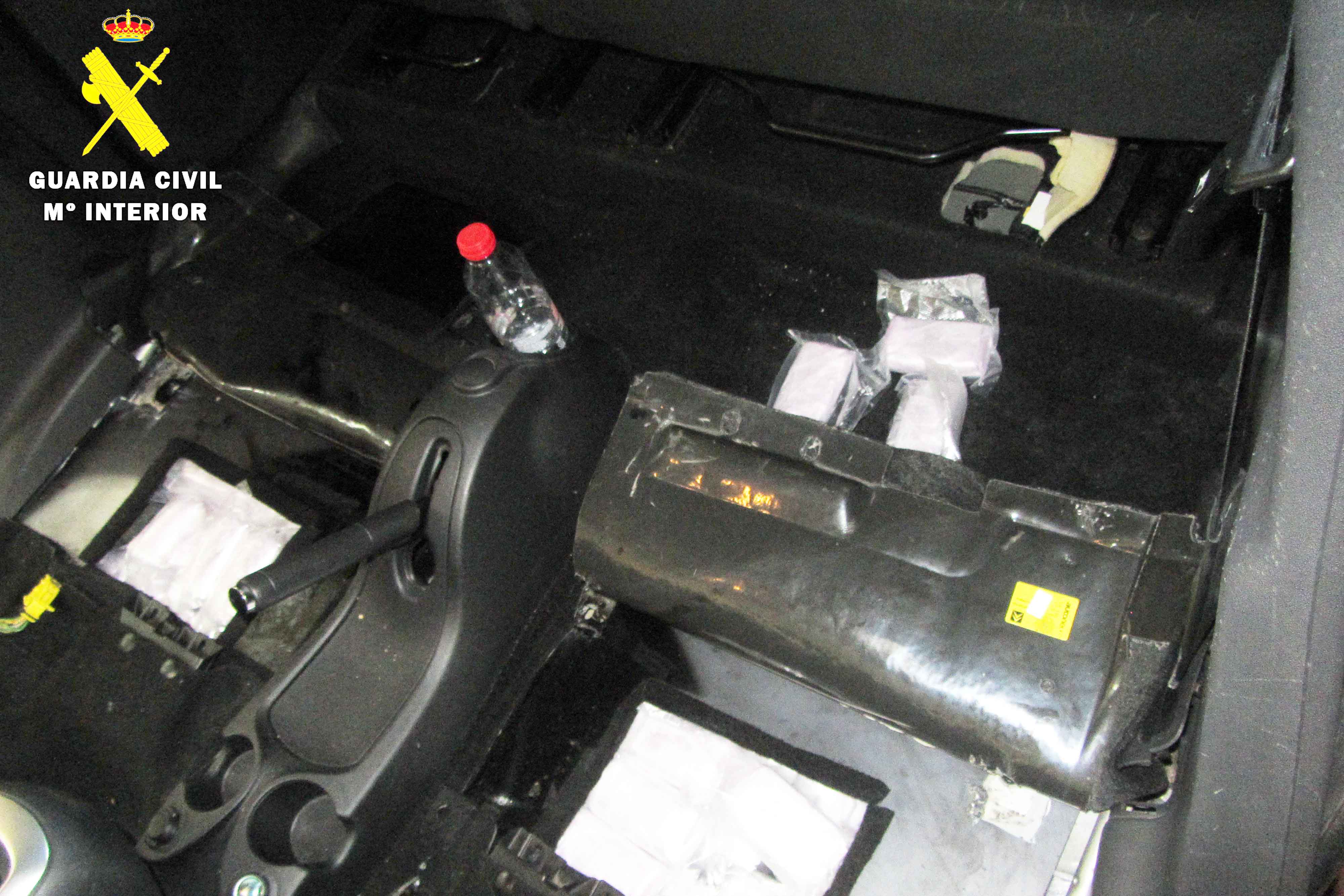 Así, se procedió a efectuar un exhaustivo reconocimiento del turismo interviniéndose 65.600 gramos de resina de hachís ocultos en los dobles fondos practicados en el suelo y salpicadero.