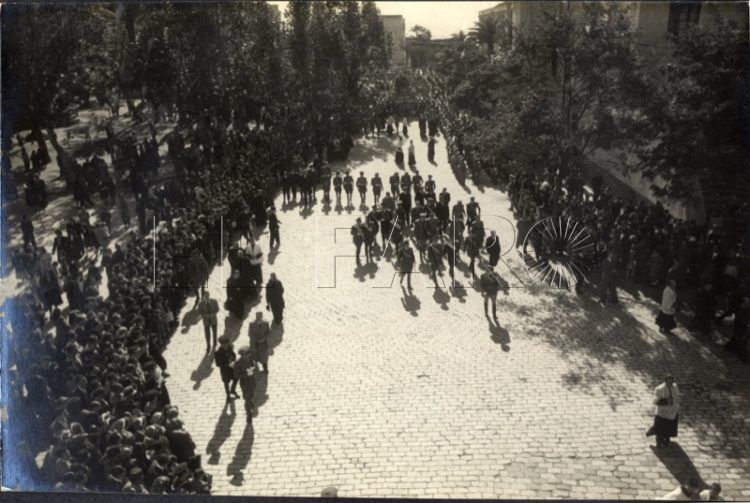 Compañía de desembarco de los cañoneros “Calvo Sotelo” y “Canalejas”, Tropas de Aviación de Tetuán, Infantería, Artillería, Ingenieros, Sanidad Militar, Automovilismo, y en el último término La Legión que la acompañó en su recorrido por las principales calles de la ciudad, con Gloriosos Guiones y a los acordes del Himno del Tercio.