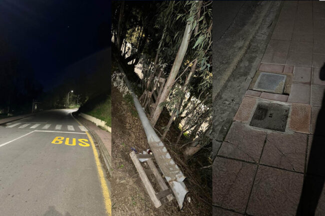 Como si de una broma macabra se tratara, la farola que fue derribada en este accidente ha quedado tirada en el monte situado al lado de la propia parada.
