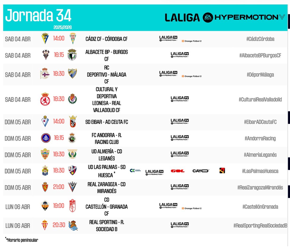 “LALIGA ha confirmado los horarios de la jornada 34 de LALIGA HYPERMOTION de la temporada 2025/26, que arrancará el sábado 3 de abril a las 14:00 con el partido entre Cádiz y Córdoba y finalizará el lunes 5 de abril a partir de las 20:30h con el duelo entre el Real Sporting y la Real Sociedad B” emitió el estamento liguero en un comunicado.