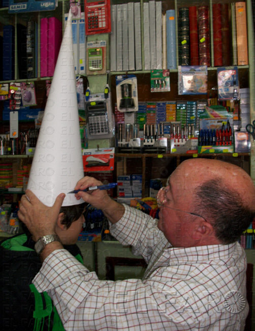 Tras el mostrador de la papelería Imperial, Victoriano Seglar lleva unas cuatro décadas elaborando capirotes para multitud de penitentes caballas La lluvia que en 2012 ahogó parte de nuestras procesiones ha restado algo de trabajo a Victoriano Seglar estos días, pero aún así hasta última hora del miércoles el mostrador de su papelería, Imperial, estaba repleto. Lleno de jóvenes y niños que, hartándose de paciencia, esperaban su turno. “Hay algunos que se pegan hasta dos horas esperando, es que hay momentos en los que no doy a basto”, cuenta mientras sin levantar la mirada de la cartulina blanca la moldea. El destinatario de este capirote, uno más de los alrededor de 200 que ha realizado este año, es el pequeño Hugo Almagro. Espera nervioso a que Victoriano termine su trabajo, pues será su primera vez como penitente, a la par que escucha atento las recomendaciones que el artesano le hace a su madre acerca de la conveniencia de utilizar un lazo (en lugar de goma) para que el cono se amarre al rostro de Hugo sin hacerle daño.
