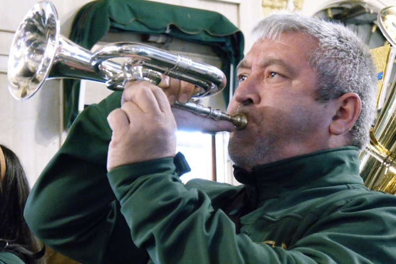 En la iglesia de Los Remedios, los músicos de la Banda de la Encrucijada ultimaban los detalles para el inicio del pasacalles a la vez que hacían sonar los tambores que anunciaban que algo iba a ocurrir.