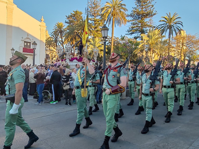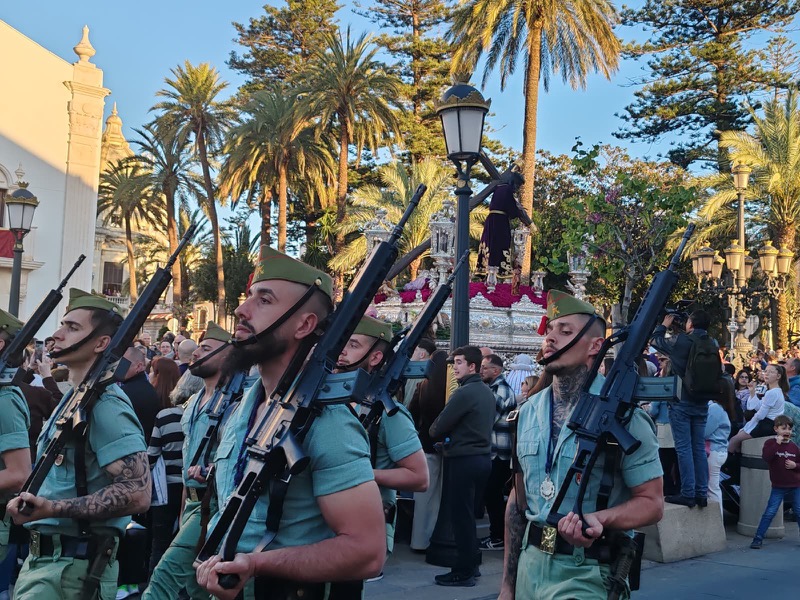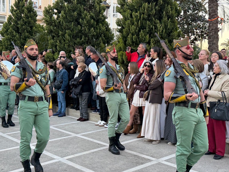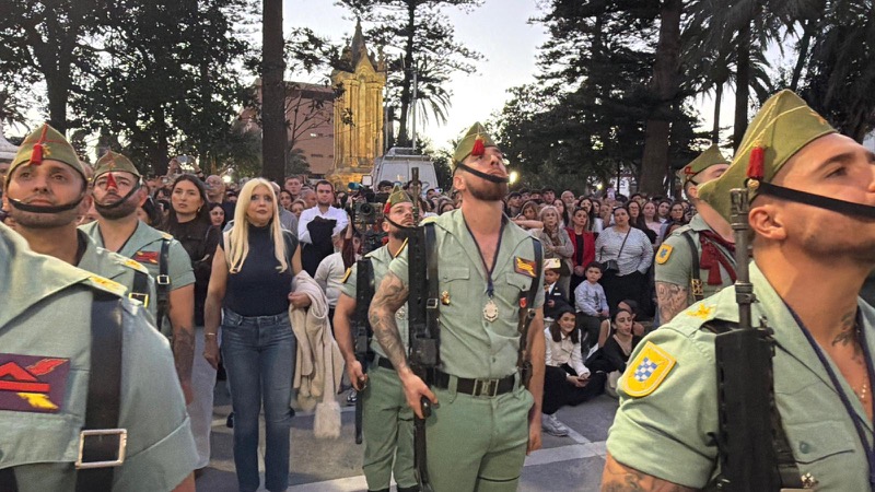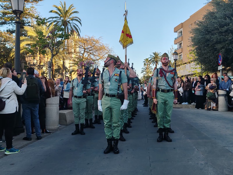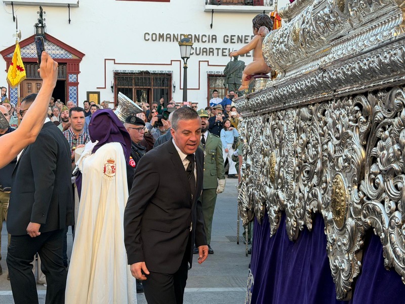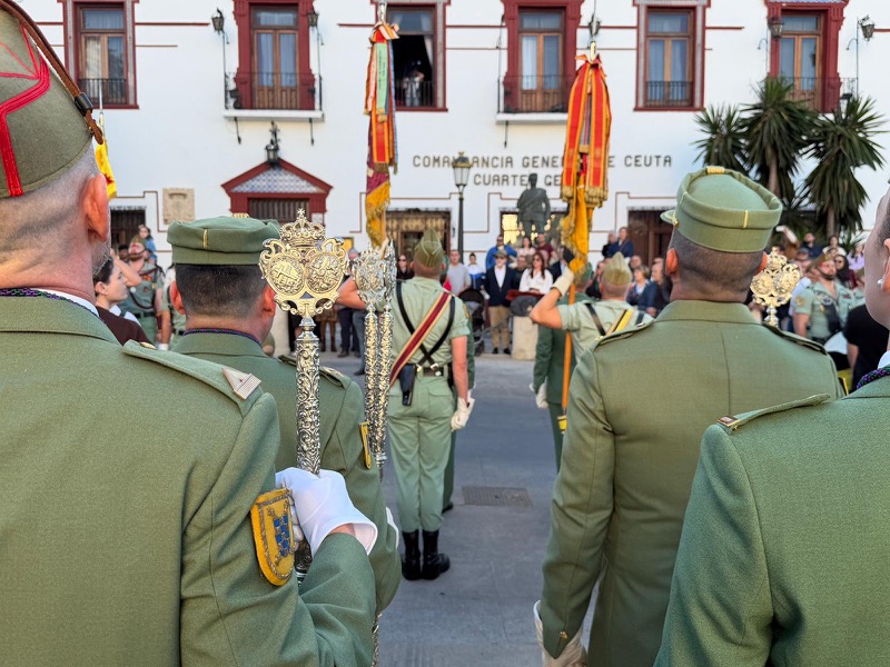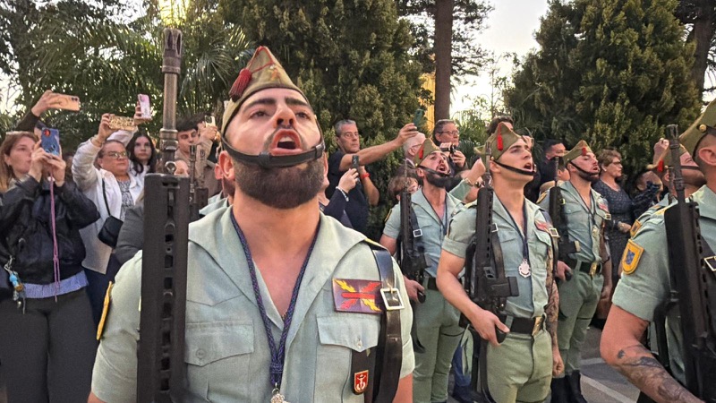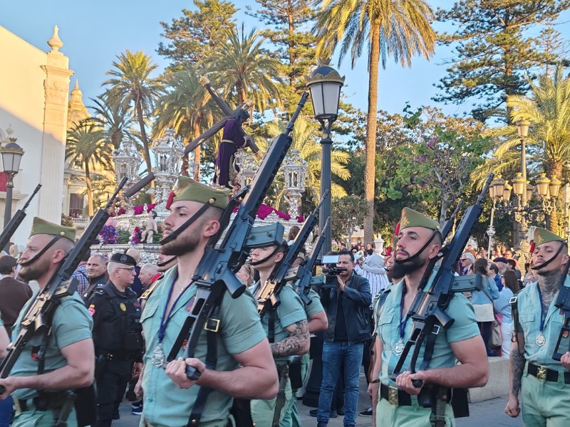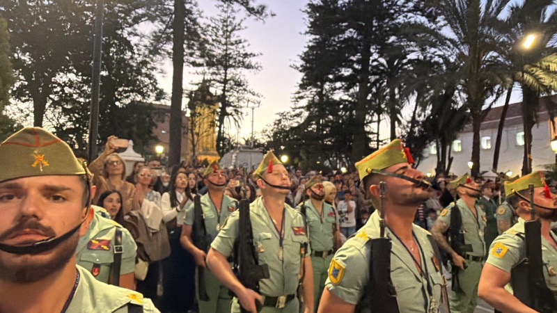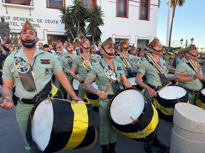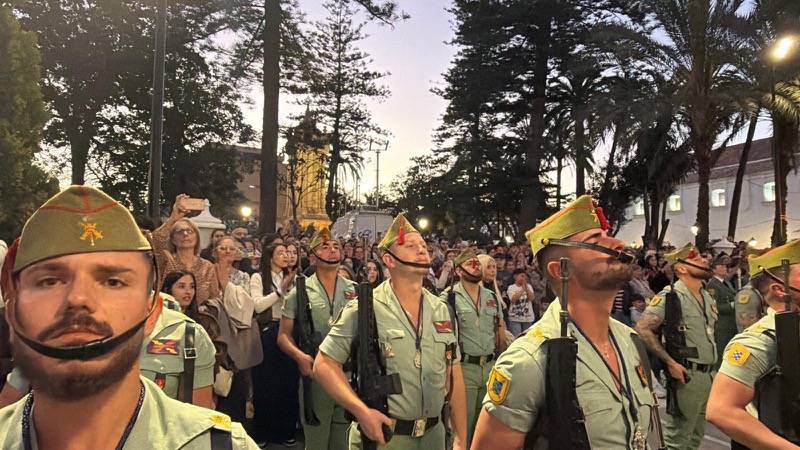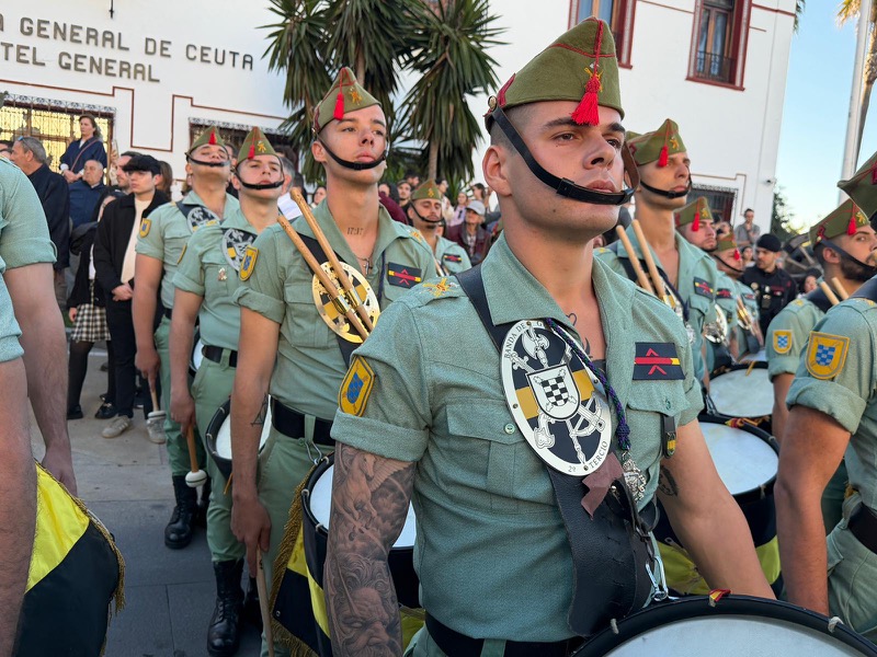 El sonido del ‘Novio de la muerte’, interpretado por La Legión, envolvió la plaza con una fuerza sobrecogedora, elevando la emoción de los presentes. La escena, repetida año tras año, no pierde su capacidad de conmover y sigue siendo uno de los grandes iconos de la Semana Santa ceutí.
