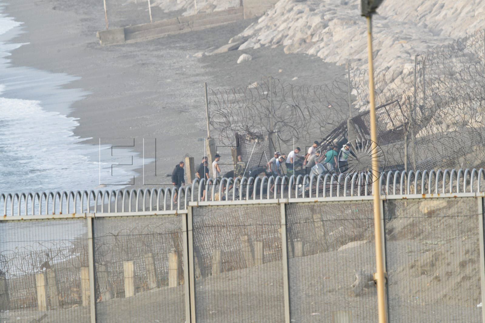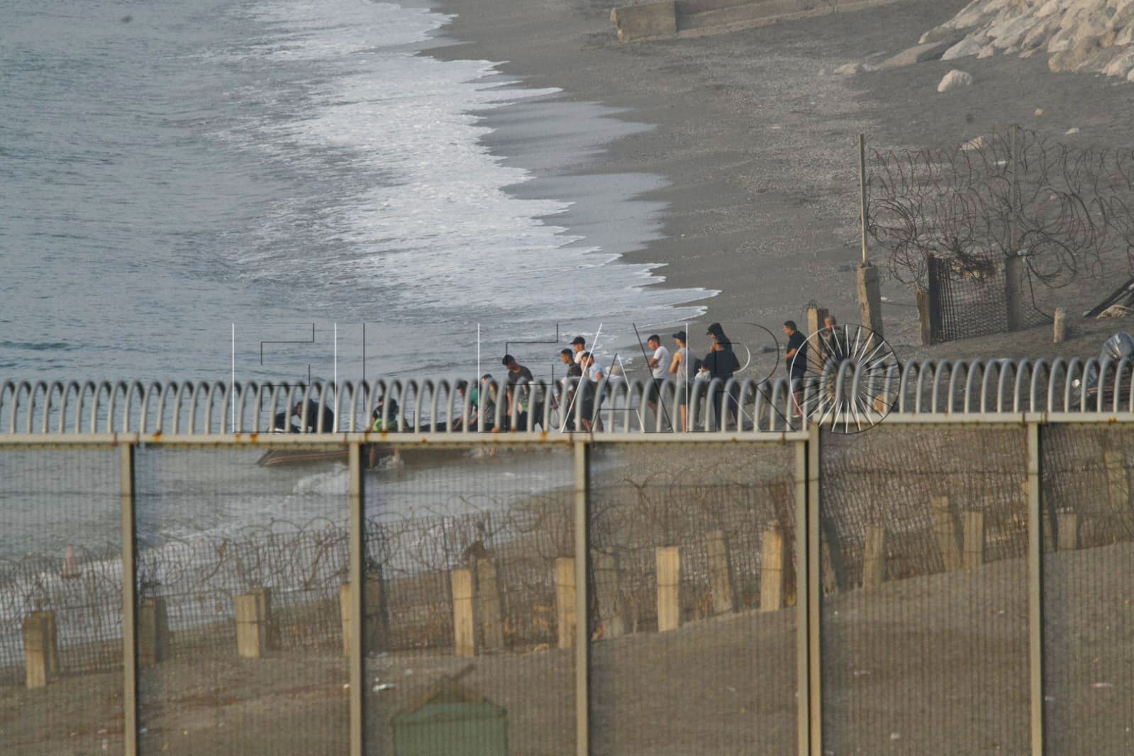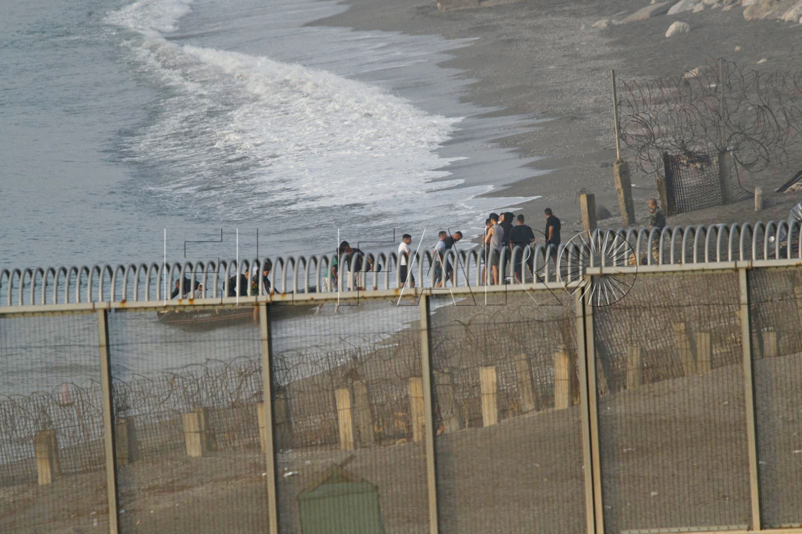 Toda la playa del Tarajal y Almadraba estaba, a primera hora, blindada con agentes. En los arenales y en el mar custodiaban la línea fronteriza.