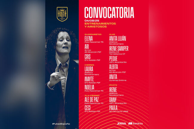 La seleccionadora absoluta de fútbol sala, Clàudia Pons, anunció este lunes la convocatoria de 16 jugadoras para la primera concentración de la temporada. Las jugadoras se reunirán el 18 de agosto en la Ciudad del Fútbol de Las Rozas (Madrid). Como parte de su preparación inicial, el combinado español disputará un amistoso el 23 de agosto frente al equipo cadete masculino del MRB Móstoles.
