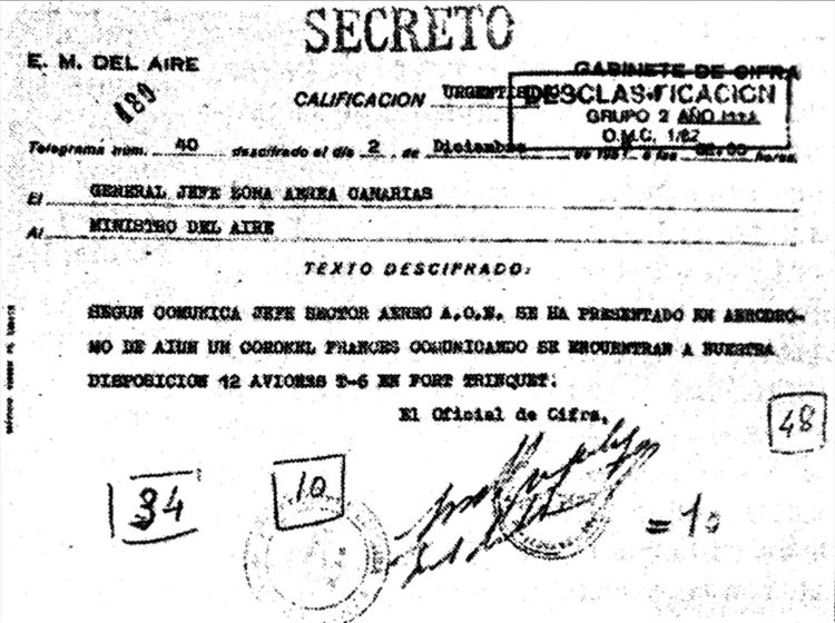 Y, finalmente, el telegrama nº 40 del general de la Zona Aérea de Canarias al ministro del Aire dice: “según comunica Jefe Sector Aéreo ‘AOE’ se ha presentado en Aeródromo Aaiún un coronel francés comunicando que se encuentran a nuestra disposición 12 aviones T-6 en Fort Trinquet, 2 de diciembre de 1958. El oficial de Cifra. Hay un sello Estado Mayor del Aire”.