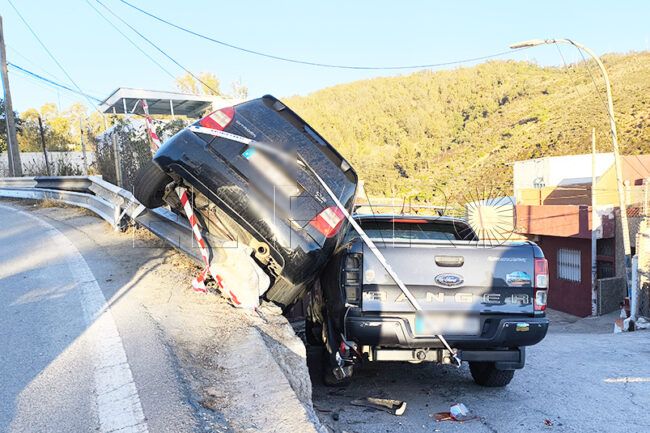Un vehículo ha superado la barrera de seguridad para terminar prácticamente volcado encima de otro que estaba estacionado justo al lado de una vivienda.