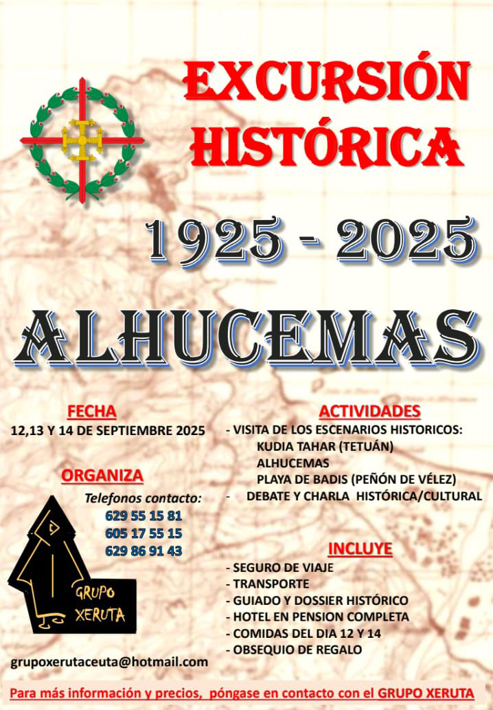 El Grupo Xeruta, asociación sin ánimo de lucro con sede en Ceuta dedicada a la difusión de la historia y la cultura de España en África y en las plazas de soberanía, ha organizado una excursión histórica a Alhucemas los días 12, 13 y 14 de septiembre. El objetivo es conmemorar el centenario del desembarco de Alhucemas, uno de los acontecimientos militares más destacados del siglo XX en el norte de África.