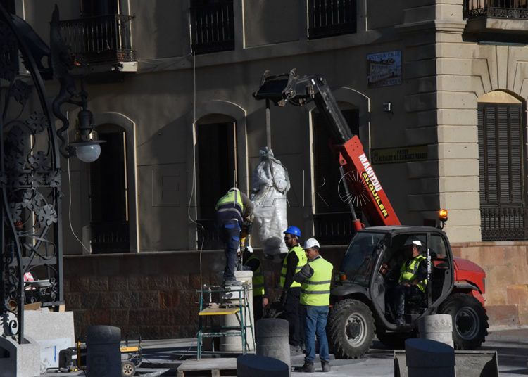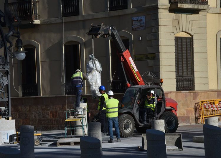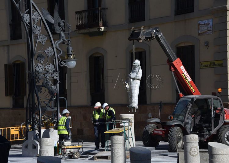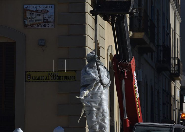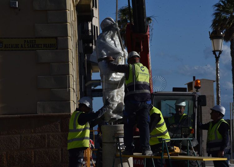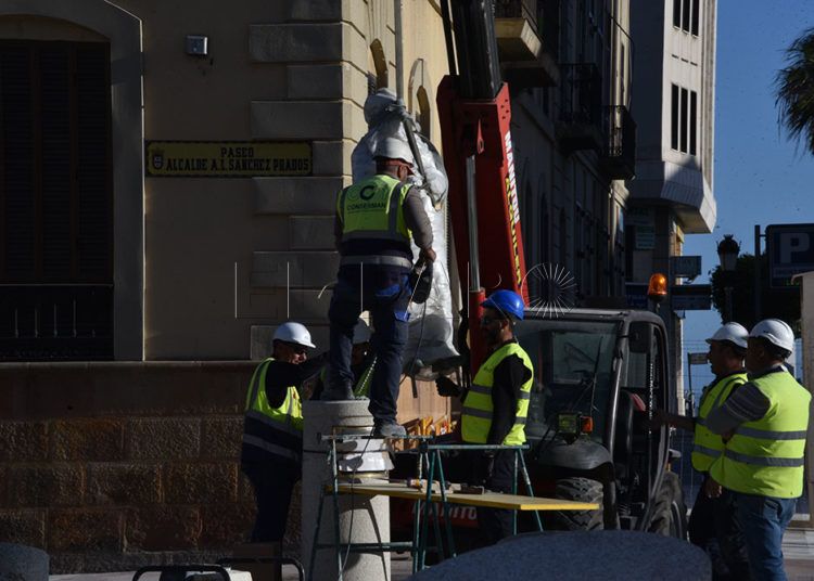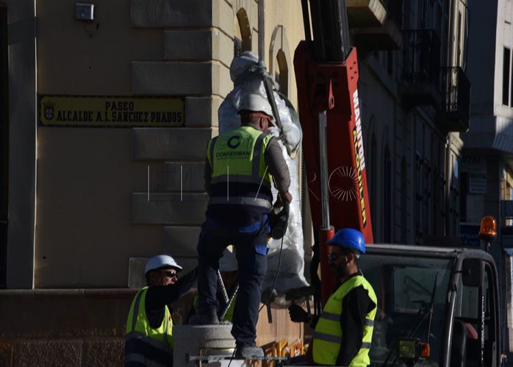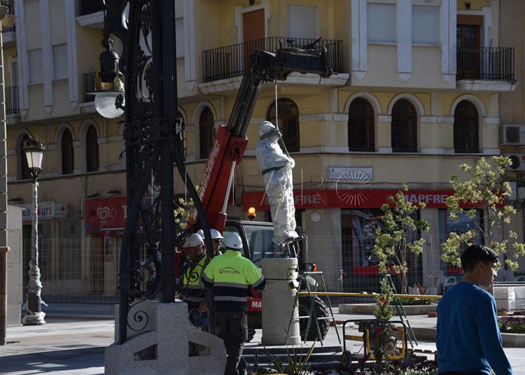 Los operarios han colocado este miércoles los dragones en las farolas y han devuelto la estatua del alcalde Antonio López Sánchez-Prado a su pedestal de Gran Vía.