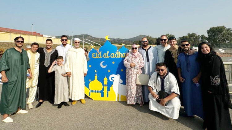 La han colocado delante del lugar habilitado para el rezo con el fin de que las familias y amigos pudieran hacerse una foto delante de esta obra realizada en tonos azules y amarillos y en donde aparecían simbolizados el cordero, la mezquita y la media luna.