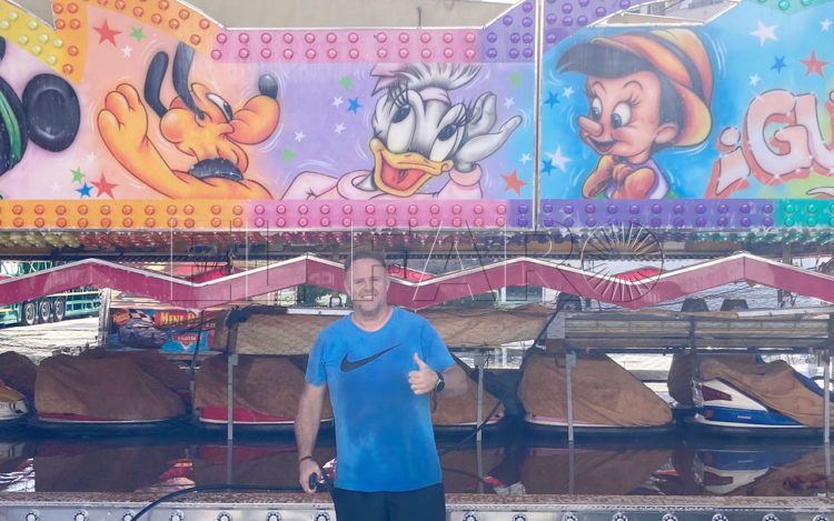 El empresario sevillano es dueño de la atracción mini pista orientada a los más pequeños que se basa en los siempre transitados y divertidos coches de choque. Ya cuenta con la instalación prácticamente montada y señala que suele tardar en prepararla alrededor de un día.