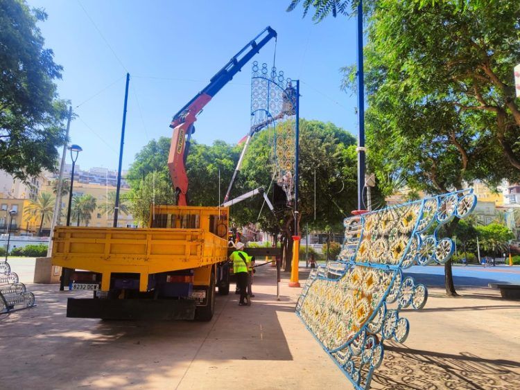 Arrancan los trabajos preparativos para la Feria de Ceuta 2023. Este pasado lunes dieron comienzo las labores de retirada del mobiliario deportivo e infantil de los bajos de la Marina y la colocación de las luminarias que alumbrarán el recinto del 29 de julio al 5 de agosto.