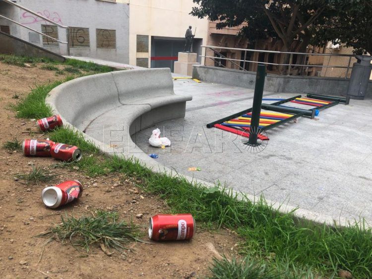 En esta ocasión, y como se puede ver en la imagen, en el espacio de ocio infantil hay restos de latas de cervezas, y bolsas. Vecinos de esta calle denuncian a través de las redes sociales el vandalismo en la zona.