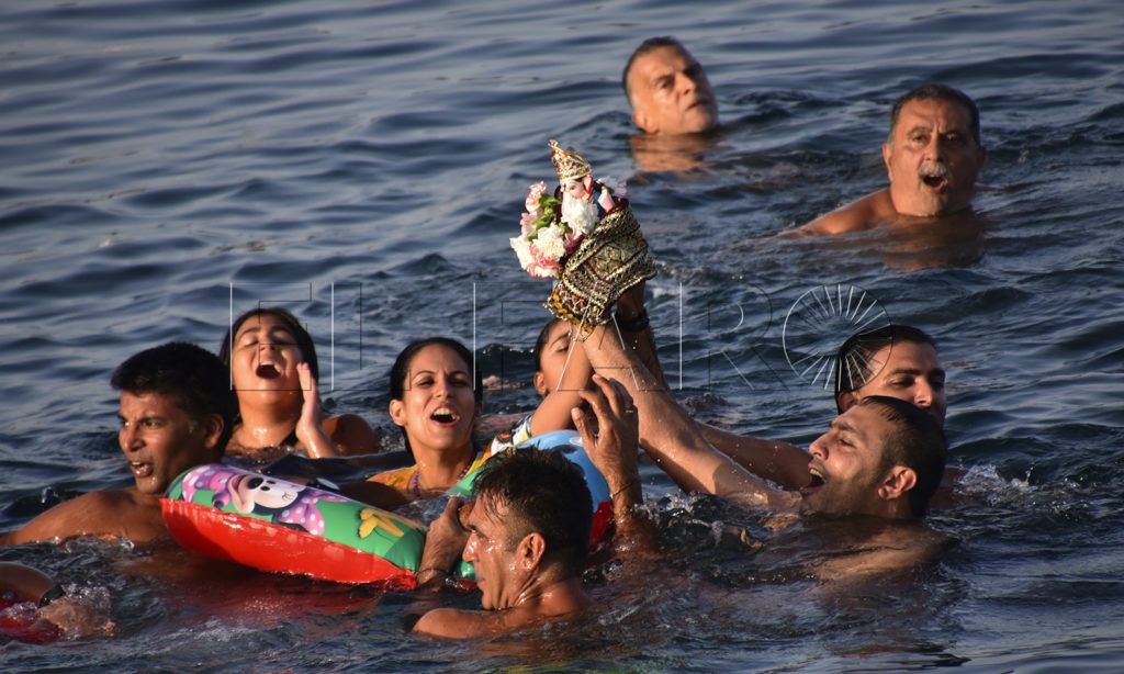 Llegó el momento de llevar al Dios elefante al fondo del mar y varios miembros de la Comunidad Hindú lo instalaron sobre una pequeña balsa neumática y lo llevaron nadando varios metros hacia el interior para hundirlo entre cánticos y ofrendas.