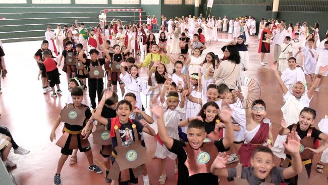 La elección de la historia grecorromana ha permitido al alumnado sumergirse de lleno en un aprendizaje divertido. Los alumnos de infantil han representado a Venus y Hércules. Los de segundo eran emperadores y emperatrices. Tercero reflejaba la importancia de las musas y los filósofos; Los guerreros se han apoderado de los alumnos de cuarto. Los de quinto se han vestido de Patricios; y, por último, sexto curso ha representado a Atenea y Poseidón.
