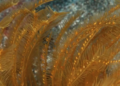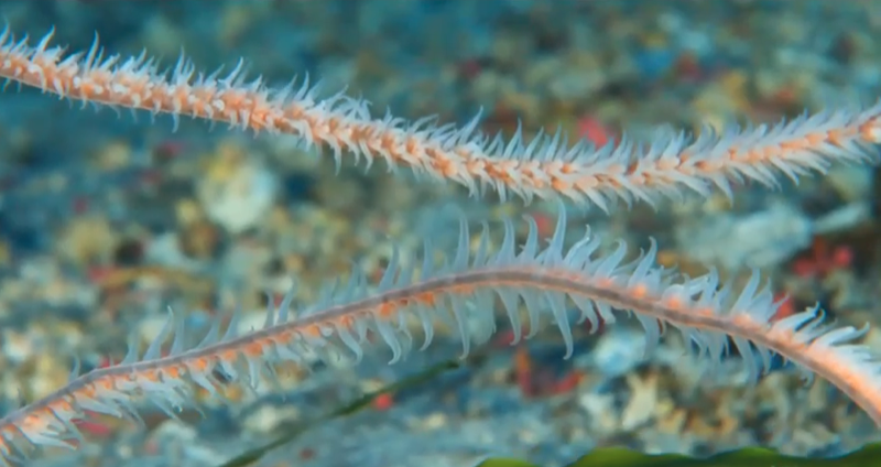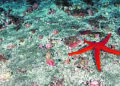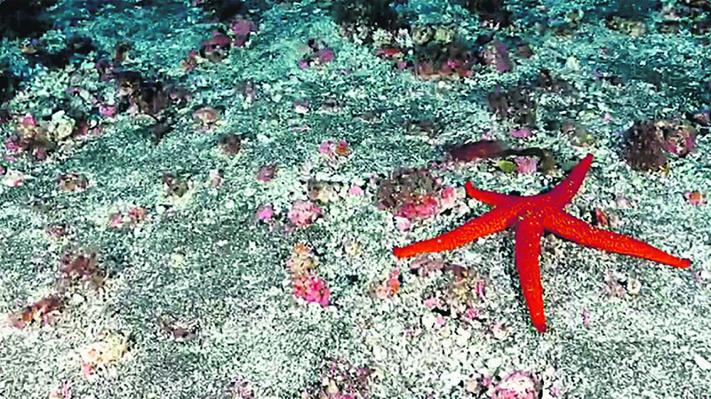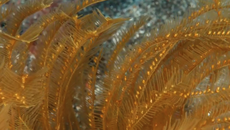 También se desarrollan sobre estos pequeños oasis duros, las mentadas algas calcáreas, grandes concentraciones de hidroideos que forman abigarrados plumeros de intenso color amarillento dando un llamativo contraste de coloración a estos entornos sumergidos. Todo tiene un aspecto algo espectral, incluso podrían intuirse los espejismos propios del desierto, querríamos ver aparecer grandes rocas y bajas en mitad de estas inmensidades. Algunas lacónicas estrella de mar de la especie Echinaster sepositus se pasean tintadas de rojo sangre, pero sin duda el espectáculo más impresionante e inesperado lo construyen unos larguísimos corales negros del género Stichopathes que a modo de espectros zoológicos van poblando de extraña belleza alienígena estos entornos desolados y completamente ignorados por los buceadores canarios. Todo esto lo puedo contar, no por mi experiencia propia en estas profundidades sino por las grabaciones artísticas y musicales de Rafa Herrero. Mucho queda por contar sobre biología y geología de la isla colombina pero no será en este relato.