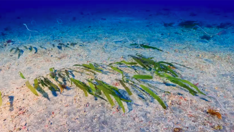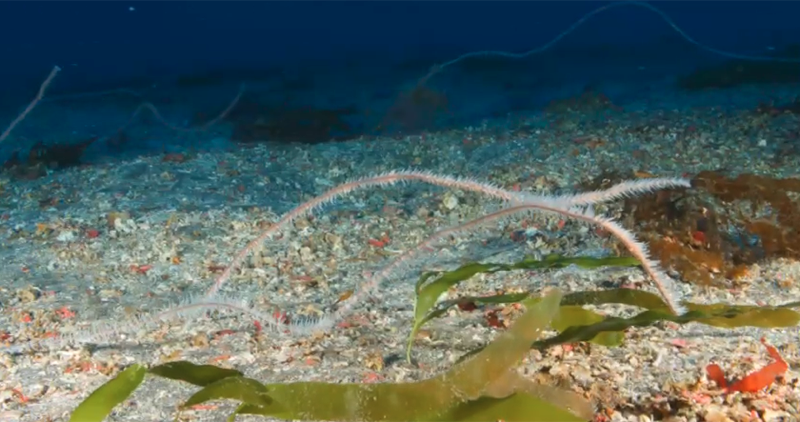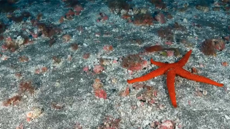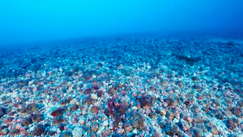 De forma sorprendente, los fondos circalitorales gomeros son muy diferentes a todos los que conocemos del archipiélago canario. En vez de escarpes rocosos, nos encontramos con inmensas planicies ocupadas por preciosos fondos de rodolitos, algas calcáreas libres que formas los famosos lechos de anises que llaman los pescadores por su estridente olor cuando estas algas calcáreas están fuera del agua. Y en vez de arrecifes de rocas y grandes bloques el aspecto del fondo mesofótico es el de unas llanuras plenas de sedimentos arenosos con estos rodolitos colonizados tímidamente por preciosos plumeros de algas pardas del género Sphoroccnus, que debido a la corriente se mantienen pegados al fondo.