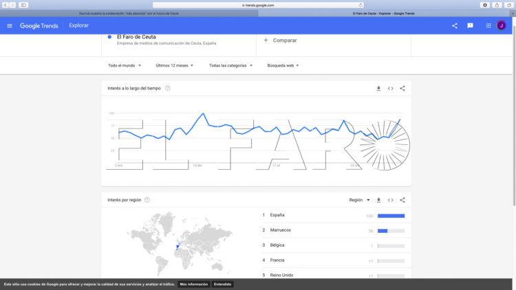 La herramienta de Google identifica este último acontecimiento como el momento en el que Ceuta ha generado una incidencia mayor a nivel nacional en búsquedas (valor 100), mientras que los últimos días de junio y los primeros de junio marcan el segundo hito (81) y la primera semana de primavera, el tercero (73).