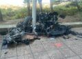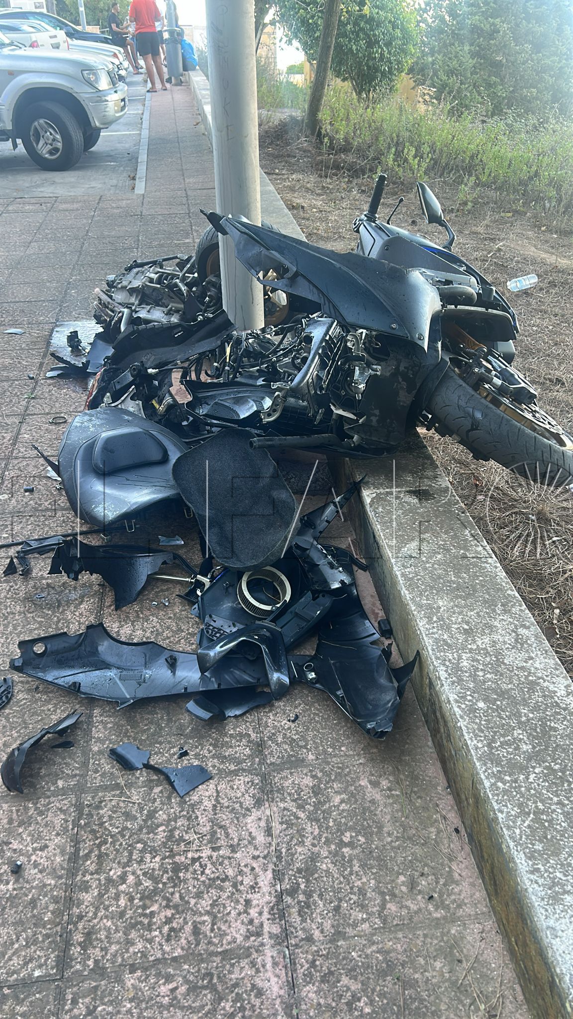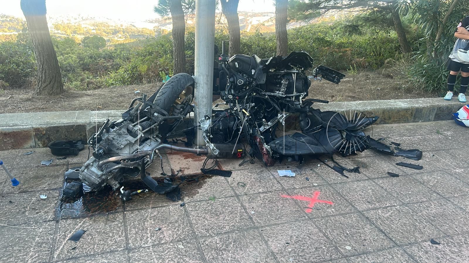 Tal y como se puede apreciar en las imágenes, el vehículo ha quedado completamente destrozado fruto del impacto registrado. El vehículo a dos ruedas ha quedado partido en dos, justo a la altura de esta farola que ha servido de freno.