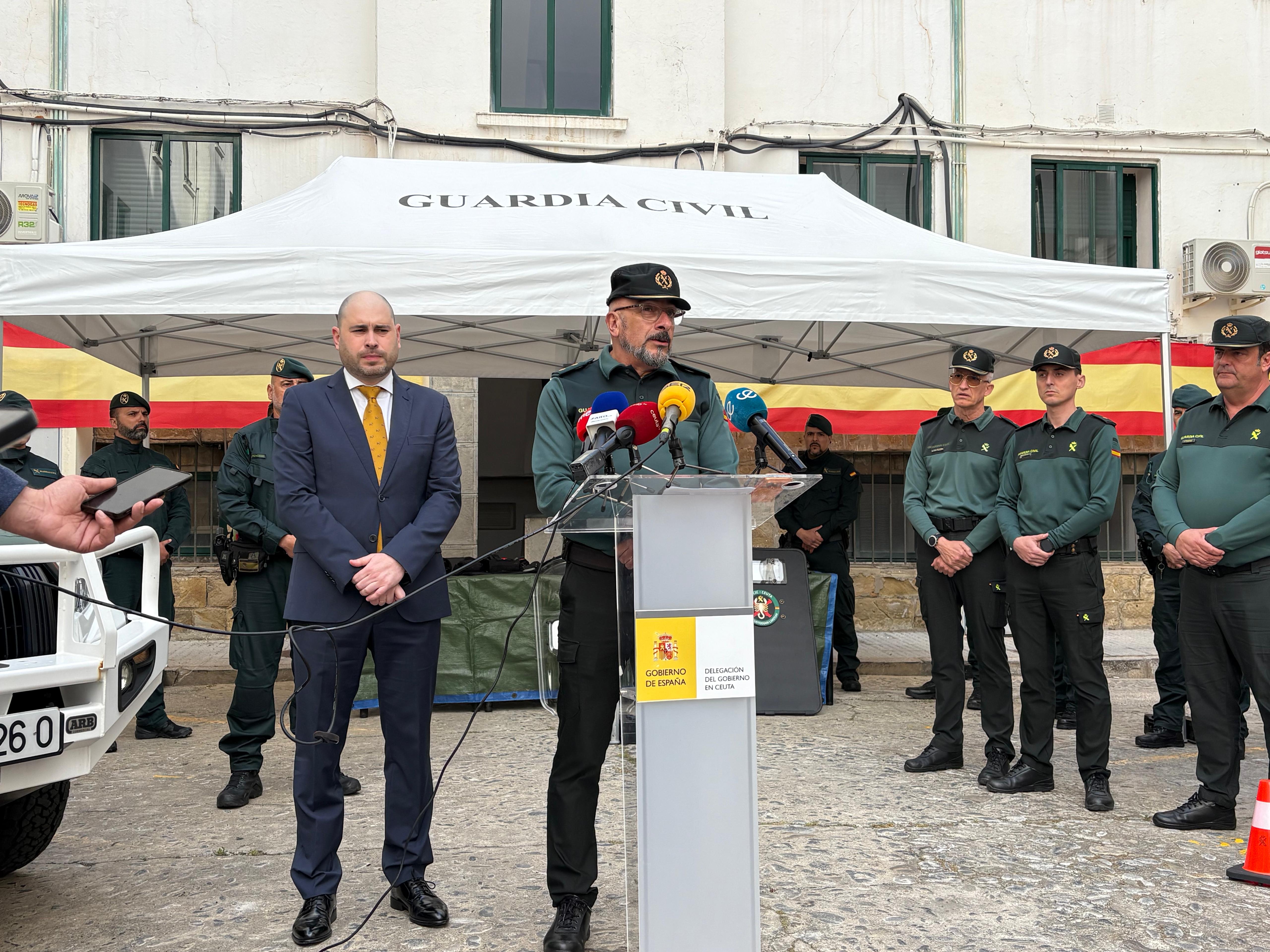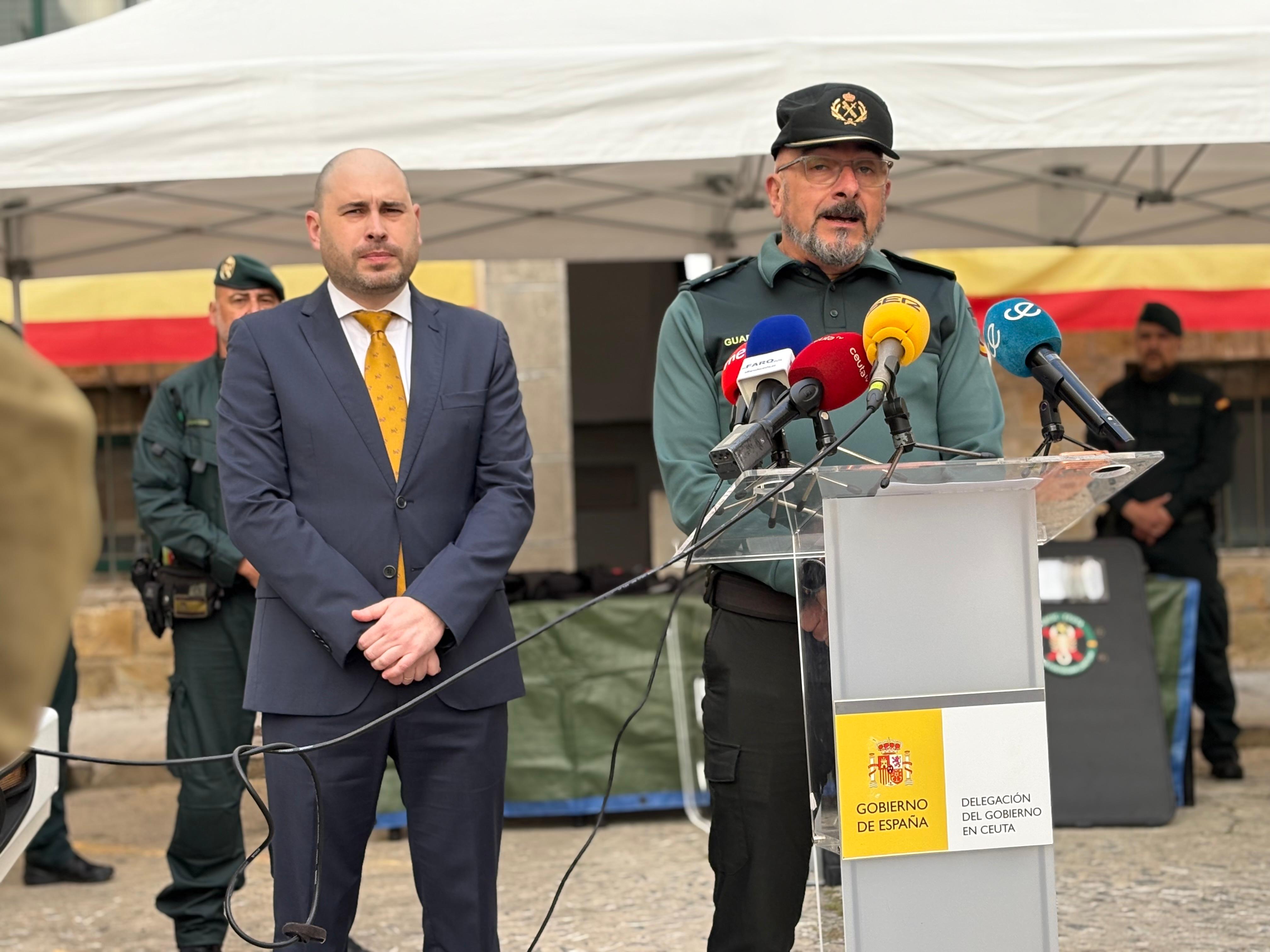 El delegado del Gobierno en Ceuta, Miguel Ángel Pérez Triano; y el teniente coronel Miguel Lobo, han sido los encargados de ofrecer los detalles sobre esta nueva unidad, que trae consigo un refuerzo de 33 agentes nuevo para la ciudad.