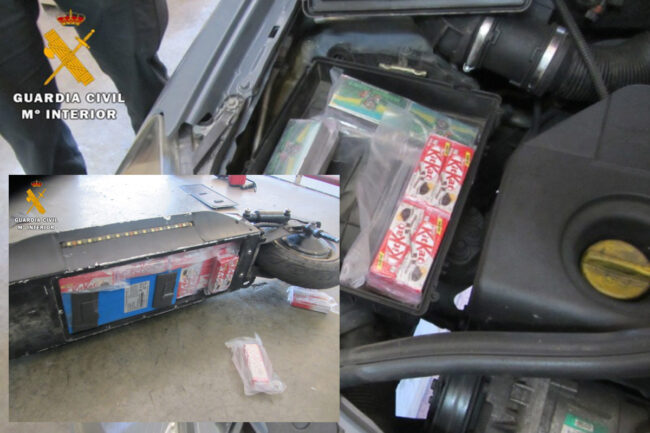 Con envoltorios de chocolate KitKat o con símbolos como el de la marihuana, así venían ocultos los distintos paquetes de droga que ha intervenido la Benemérita como prueba inequívoca de la comisión de un delito contra la salud pública.