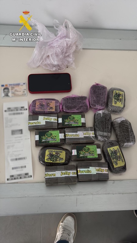 Durante la inspección, se descubrió que el sospechoso portaba 15 tabletas de una sustancia de color marrón, identificada posteriormente como hachís, encontrándose adosada a ambas piernas, alcanzando un total de 1.480 gramos tras su pesaje.