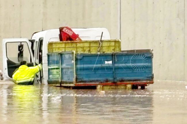 Operarios de Servilimpce estaban trabajando este sábado cuando se vieron atrapados en la zona de la carretera que conduce al cementerio de Santa Catalina. Se vieron rodeados de una auténtica piscina de agua embalsada. Ha ocurrido en Ceuta y se ha requerido la intervención de los Bomberos.