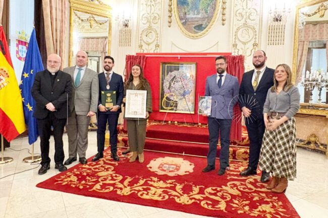 Además, “en el centro de la composición, una circunferencia en tonalidades verdes, rosas y azules, enriquecida con delicados motivos ornamentales y rematada con perlas, rinde homenaje a Ceuta, la ‘Perla del Mediterráneo’. En este marco de belleza y simbolismo se alza la Virgen del Rocío sobre su peana, tal como se venera en el Simpecado de la Hermandad”, ha especificado Pablo Rosa.