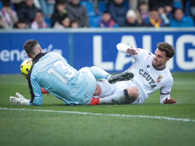 De seguido, el Ceuta tuvo su ocasión más clara del encuentro. Kuki se la dio, con un pase sensacional, a Redru para que fallara un uno contra uno ante Dani Jiménez.