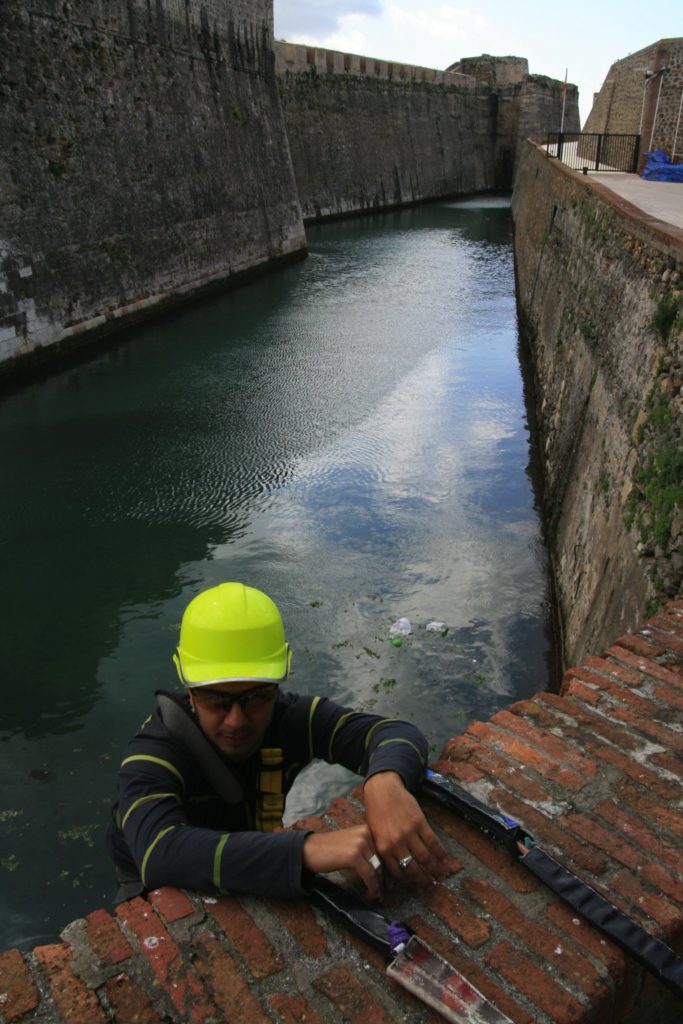 Están estos días en la zona cercana al puente del Cristo, una de las más concurridas de la ciudad. Tanto que se convierten en objeto de las miradas de ceutíes y visitantes. Desde quienes sólo pasan por allí y se asoman al balcón para ver cómo varios tipos con casco y arnés trepan por las Murallas como si lo llevaran haciendo toda la vida, hasta un grupo de turistas japoneses que se paran, asombrados. Uno de ellos, tras repasar con detenimiento sus conocimientos de español, consigue preguntar: “¿Qué estáis haciendo allá abajo?”. No parecen entender la respuesta, pero les gusta igual.