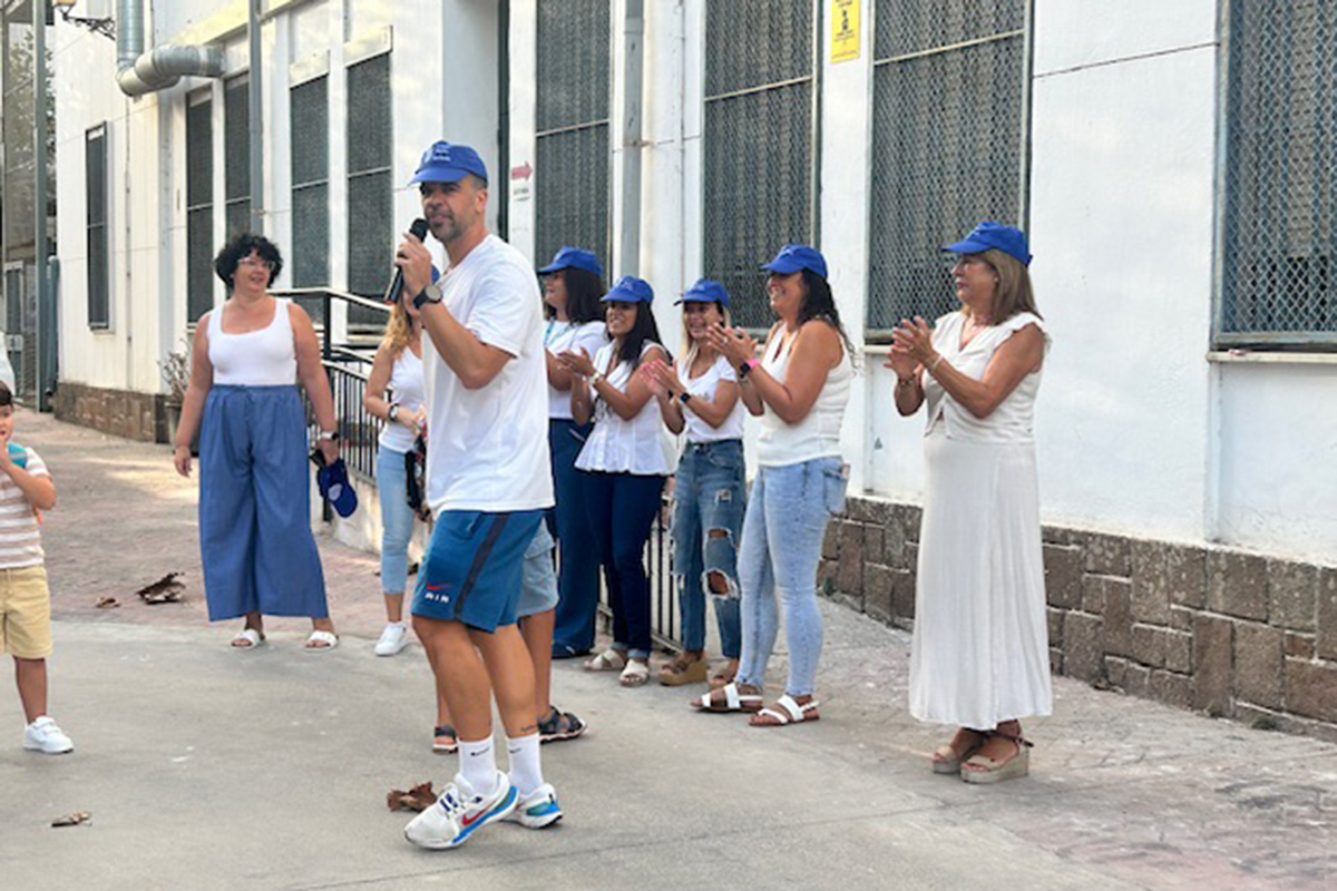 Para ello, una parte del profesorado se ha uniformado con vaqueros, camiseta blanca y gorras con el escudo y nombre del colegio, han recibido a los alumnos en la entrada del centro al ritmo de música y con el profesor de Educación física haciendo de improvisado 'speaker'.