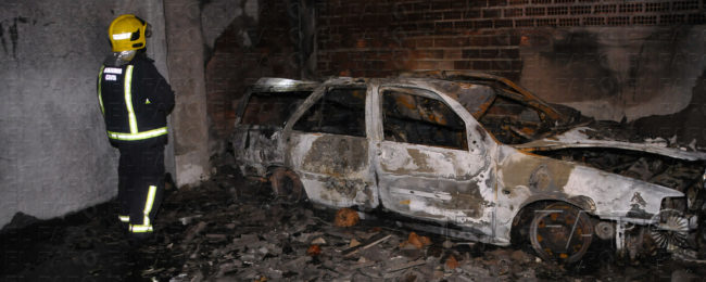 El vehículo estaba aparcado en la parte inferior de este garaje que consta a su vez de tres plantas. Se encontraba ocupando una plaza cerrada que tenía la puerta abierta y en donde ardió completamente, quedando reducida a un amasijo de hierros.