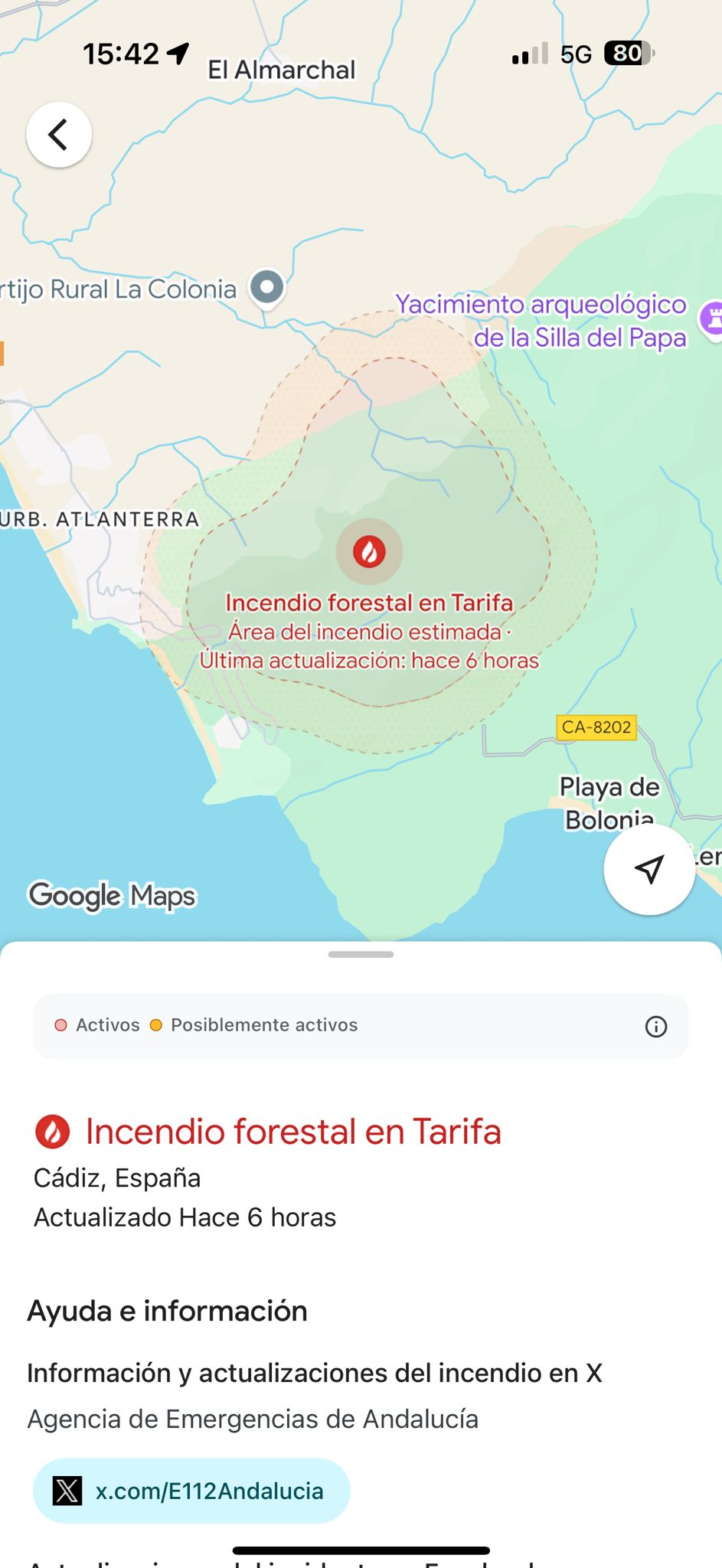 Si el usuario pulsa sobre uno de ellos, podrá acceder a información detallada procedente de fuentes oficiales, así como a datos relevantes sobre la evolución del incendio. Esto permite valorar si es seguro continuar por la ruta prevista o si conviene buscar alternativas antes de encontrarse con un corte de carretera.
