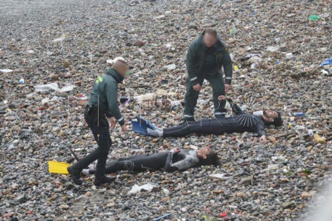 A pesar del estado del mar, hay inmigrantes que consiguen alcanzar Ceuta, aunque lo hacen exhaustos, prácticamente al límite. En el arenal de la playa del Tarajal, han llegado unos nadadores sin fuerzas, enfundados en traje de neopreno y con las aletas amarradas para no perderlas.