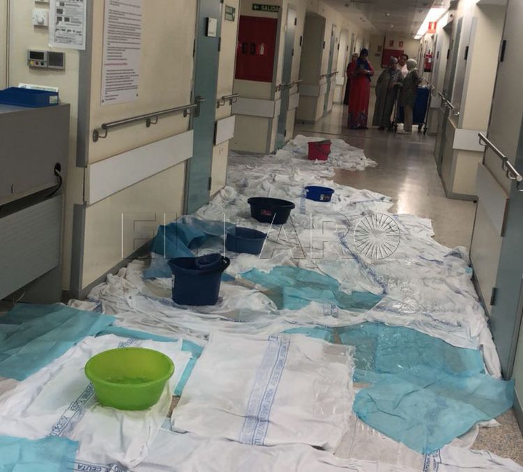 Una avería en el sistema de climatización del Hospital Universitario de Ceuta provocó una inundación en varias plantas del centro. El desperfecto se originó en un cuarto de instalacion en la segunda planta, con la rotura de un manguito de dilatación del sistema de refrigeración.